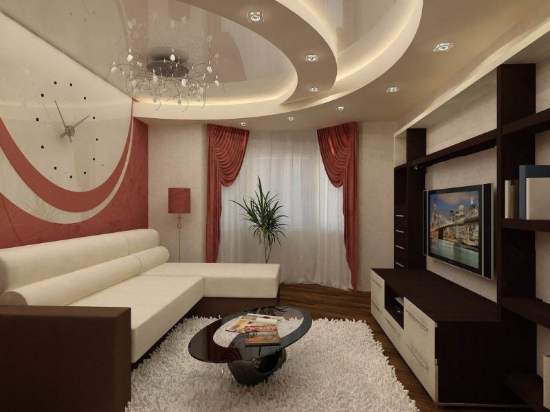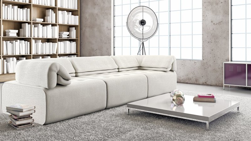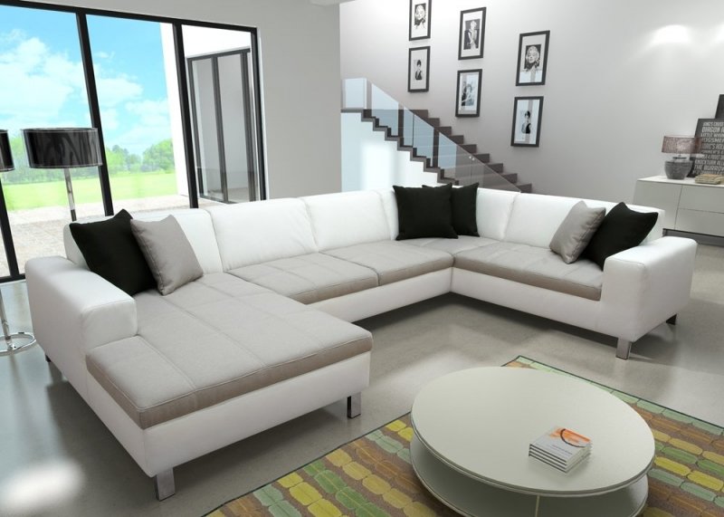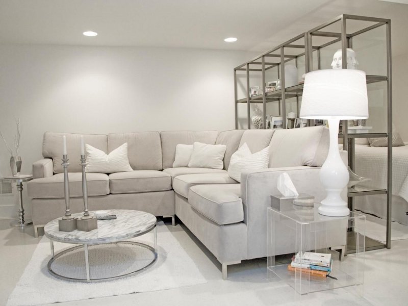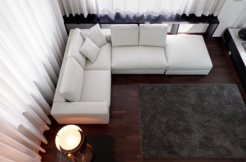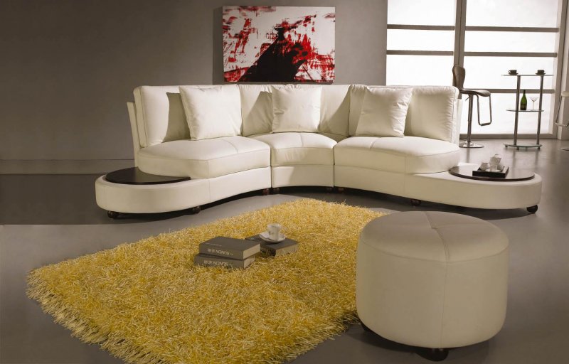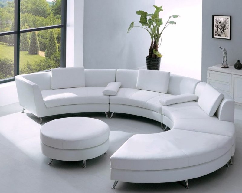 Гостиная – самая просторная комната в доме, диван часто становится ее самым крупным элементом. На нем принимают гостей, спят, играют с детьми, смотрят телевизор всей семьей. Ставят конструкцию спинкой к окнам или вдоль другой стенки, но желательно напротив телевизионного экрана. Здесь весьма удобен модульный диван, позволяющий собрать несколько разных вариантов «конструктора» с различными пуфами, тумбами, консолями и др. Белый диван здесь сочетают с креслами такого же колера, прочей меблировкой белоснежных или контрастных оттенков.