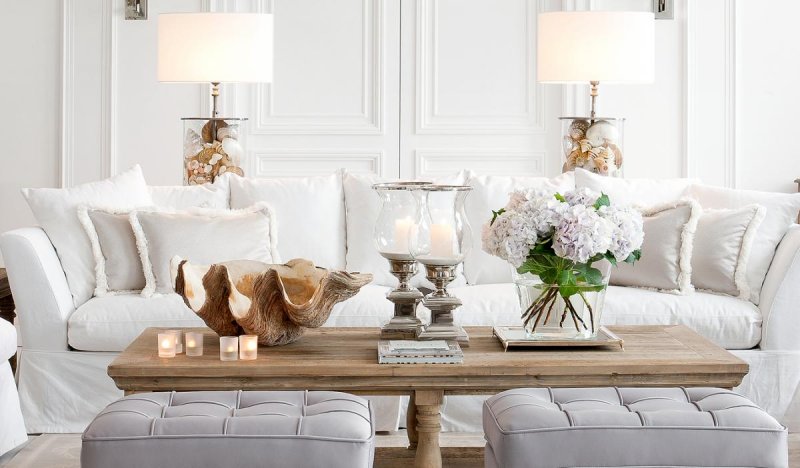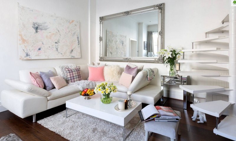 Целиком белый интерьер не слишком удобен в эксплуатации, а при недостаточном уходе смотрится грязным и блеклым. Проще сделать беленький диванчик одним из немногих светлых акцентов в более «немаркой» обстановке.