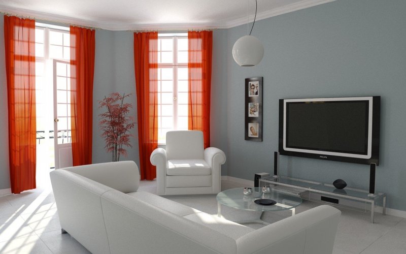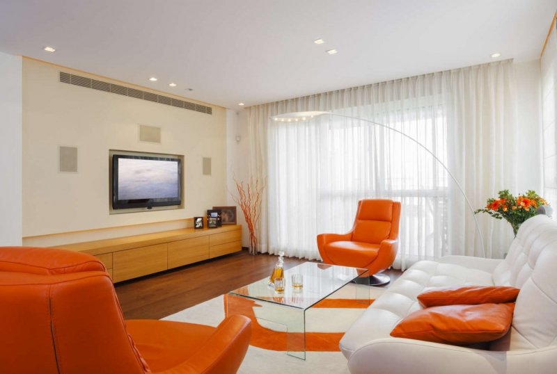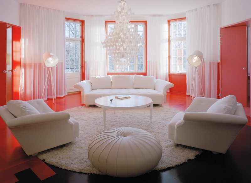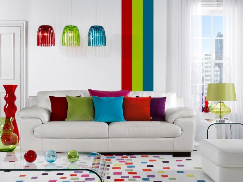 В очень просторной комнате, предназначающейся для большой семьи, кроме белоснежного ставят такой же диванчик другого, контрастного колера, но оформляют его белыми подушками. Для создания единой концепции в этом же ярком цвете выполняются подушки для белого дивана.