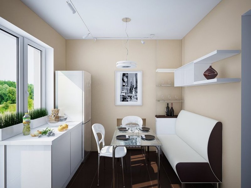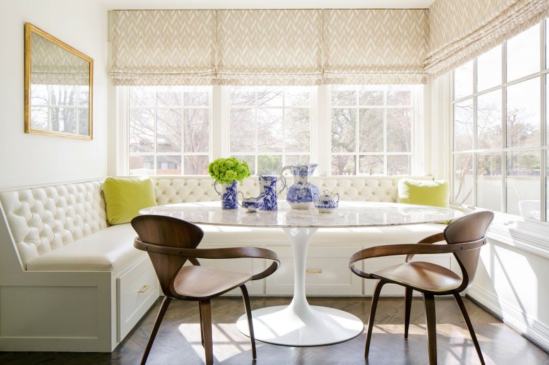 Для кухонной мебели выбираются материалы, покрытия, легко очищающиеся от капель жира, кусочков пищи, не промокающие. Подойдет натуральная кожа, кожзам, гладкие ткани. Размещать кухонный диванчик следует максимально далеко от мест приготовления пищи – холодильника, мойки, разделочной поверхности, газовой плиты. Мощная вытяжка решит часть проблем с оседанием жировой взвеси, гари на предметах меблировки, сохраняя ее первозданный внешний вид очень долгое время. Белоснежный диван хорошо смотрится напротив белого гарнитура, сочетающегося с темной или яркой напольной, стеновой плиткой, кухонным фартуком «под белый кирпич».