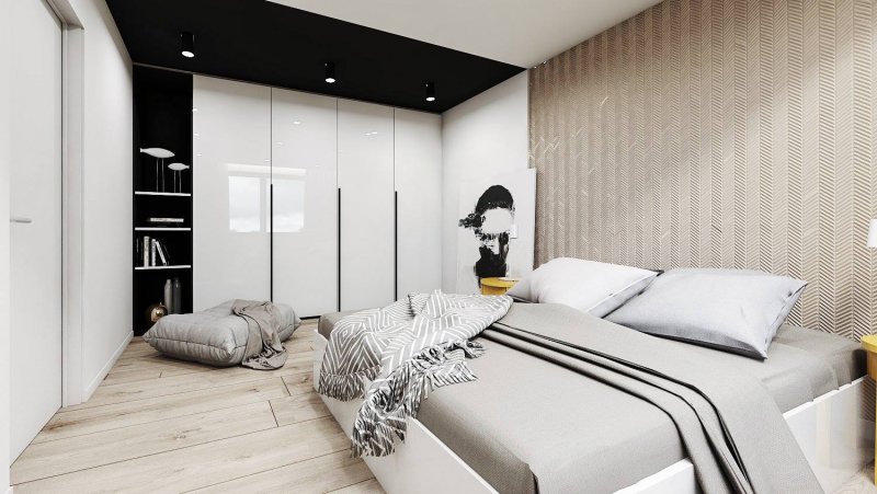 В спальном помещении раскладной диванчик используется для ночного сна или дневного отдыха, составляя единый ансамбль с кроватью, туалетным столиком, оконными шторами. Его драпируют белоснежным, черно-белым «под зебру», цветным покрывалом, оформляют подушками всех форм и размеров. Если комната используется исключительно для сна, убирать пыль придется немного реже, чем в других помещениях. Хорошо смотрится светлый однотонный диван на фоне пестрых обоев, узорчатого ковра, оформленный разноцветными подушками всех форм и размеров.