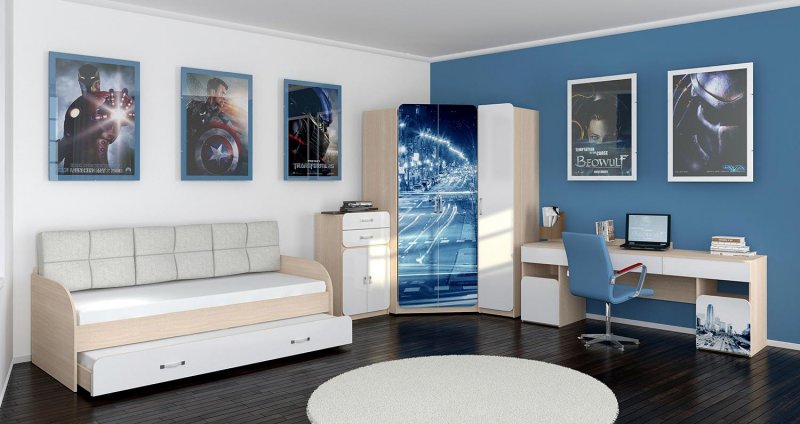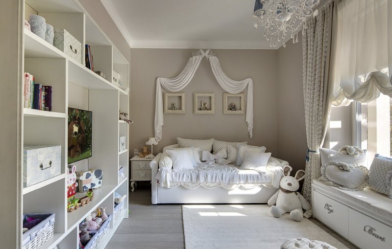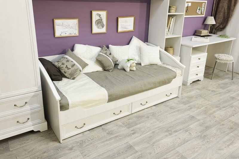 Диван для детской комнаты обычно оснащается съемными чехлами на молниях – детям, особенно младшего возраста, сложно поддерживать чистоту, потому обивку придется часто очищать, а чехлы – отбеливать. В комнате мальчика с помощью белоснежного диванчика, сочетаемого с синим ковром, небесно-голубым потолком, корабельными или пиратскими мотивами, соответствующими принтами на стенах, создается морской стиль. В девичьей его дополняют кружевными балдахинами, насыщенно-розовыми занавесками, обоями в цветочек, изображениями фей или летающих пони, создавая романтический стиль для маленькой принцессы. Подростку придется по нраву черно-белый интерьер с диваном под кроватью-чердаком, объемными подушками.