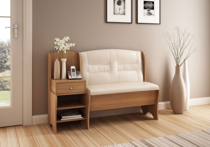 Если в ближайших магазинах подходящего по цене, конструкции, дизайну диванчика не оказалось, то при определенных столярных навыках, его возможно сделать самостоятельно, или, в крайнем случае обтянуть белой мебельной тканью другой – более подходящий по виду.