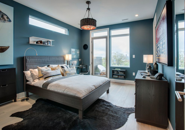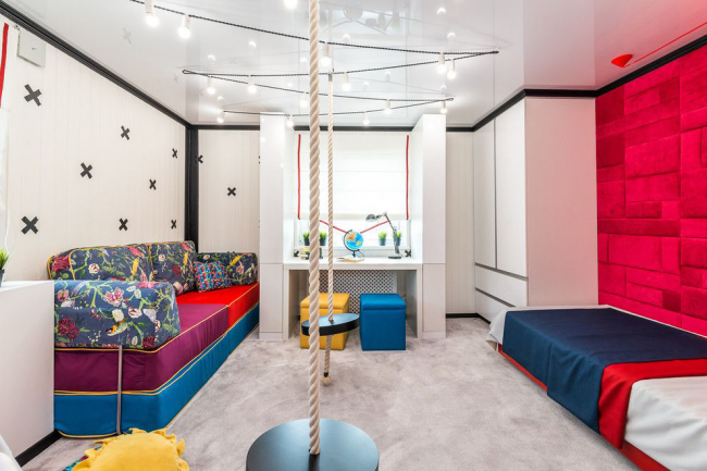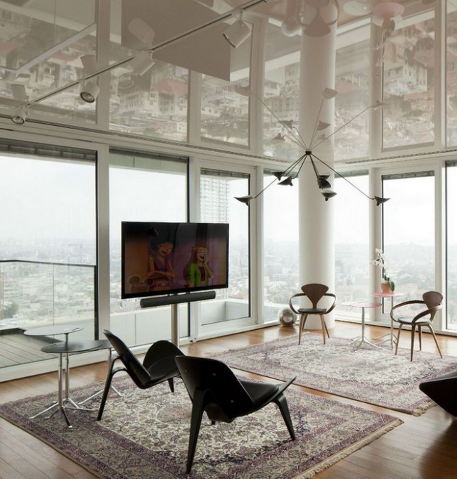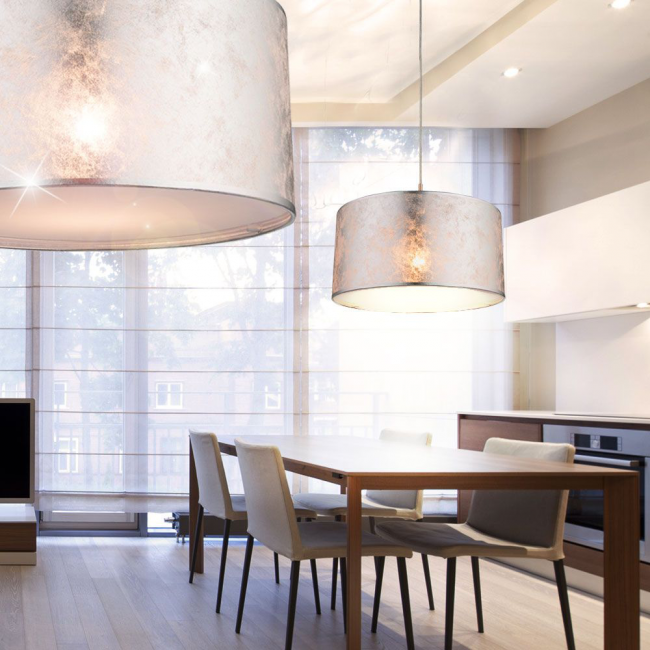 Высокие глянцевые потолки обязывают установку лампы на длинном проводе