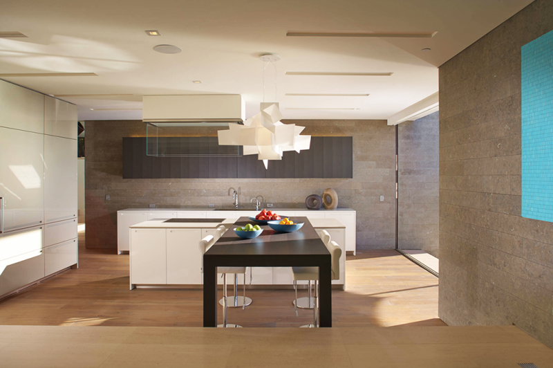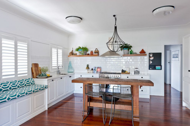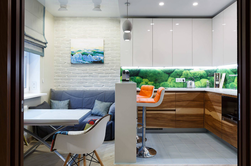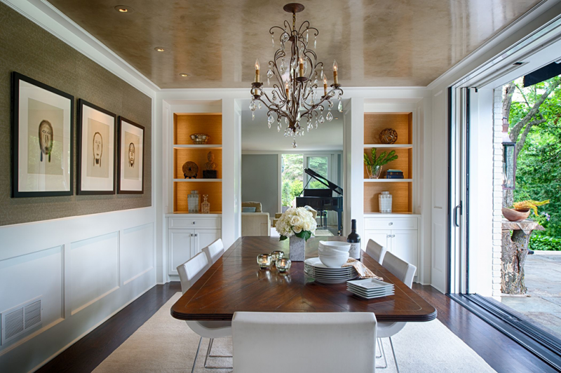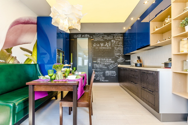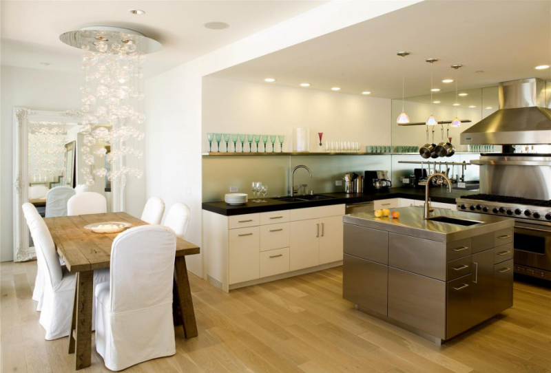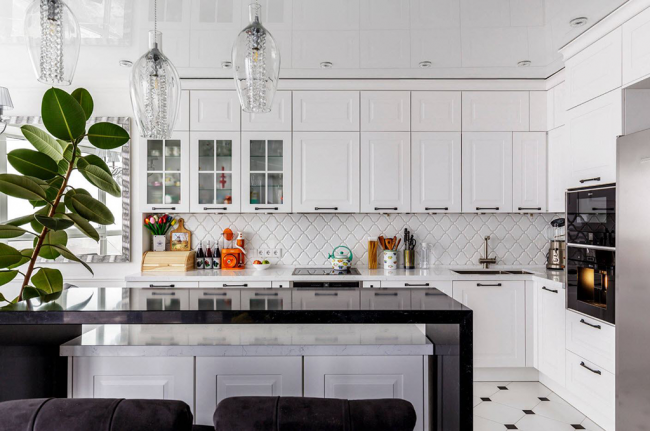Кухонный потолок украшен небольшими люстрами с плафонами