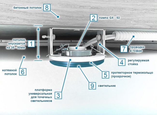 Светильники, которые прикасаются к натяжному потолку, обязательно должны быть выполненными из материала, который не нагревается