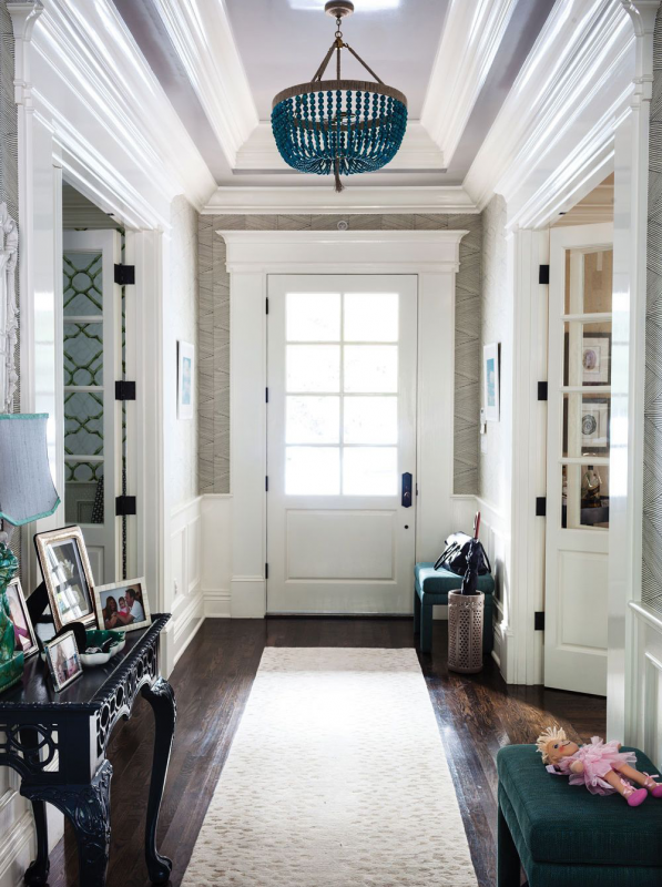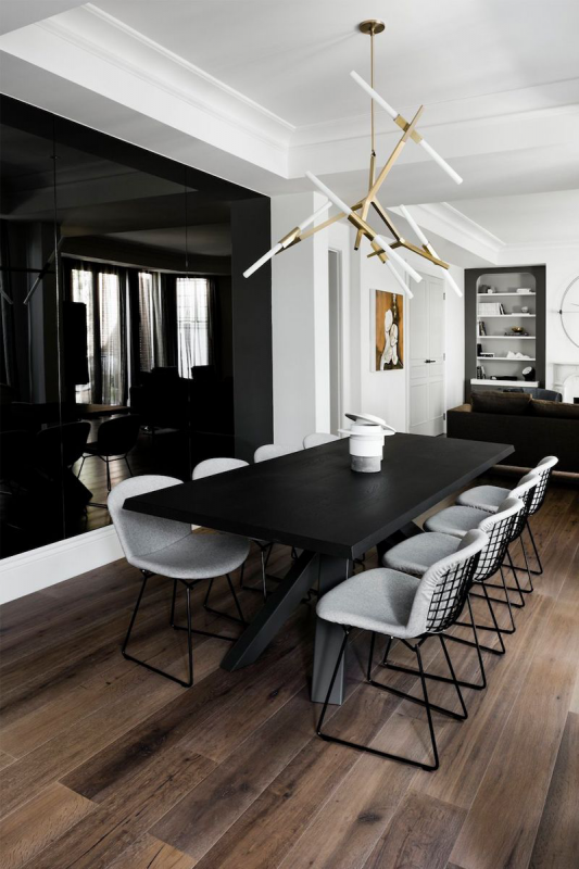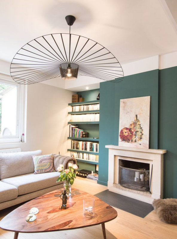 Цвет люстры выгодно перекликается с золотой палитрой в интерьере