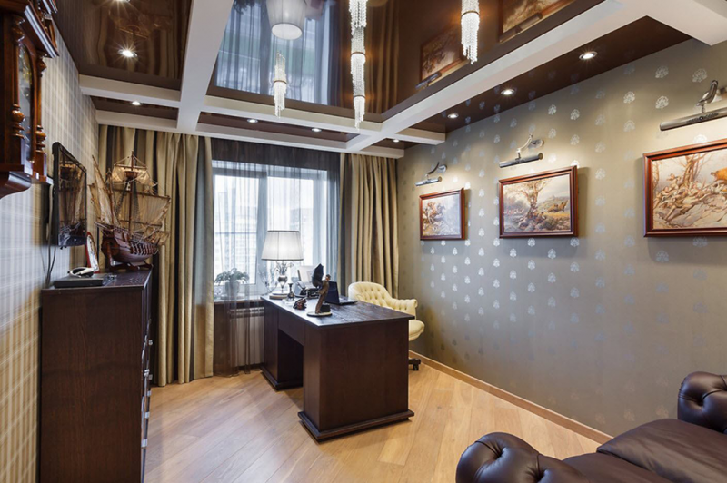 Глянцевый натяжной потолок обладает отличными зеркальными свойствами, поэтому на его плоскости будут отражаться все «внутренности люстры», поэтому стоит выбирать модели со скрытой, незаметной внутренней проводкой.