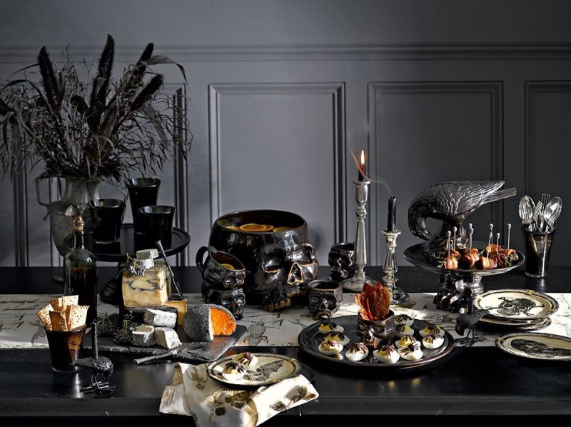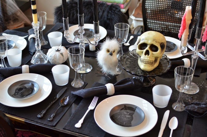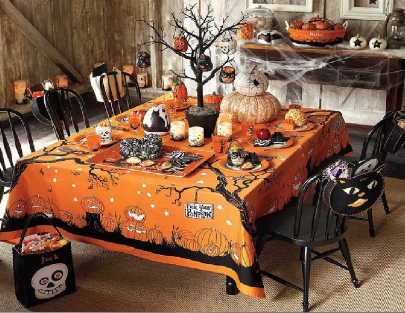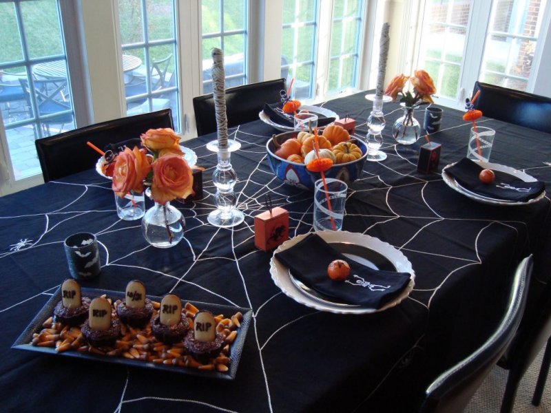 Оформление стола начинается со скатерти. Тожественное белоснежное полотно для Хэллоуина не подойдет. Выбирают скатерть ярких расцветок (оранжевая, красная, черная). В магазинах продается специальная материя с тематическими рисунками. Вместо ваз для букетов алых или белых цветов используют черепа из папье-маше, покрытые серой или черной краской. Капельку веселья внесут блестки, которыми посыпают декор, предварительно сбрызнув его лаком. Белые свечи в черных подсвечниках и ягоды смородины в прозрачных вазочках добавят обстановке мрачности. Тыквы используют в качестве светильников. В центре стола устанавливают небольшое деревце с голыми ветками в горшочке. Можно использовать и другую композицию из веточек, колосьев и подсушенных цветов. Из компонентов собирают букет, который окунают в черную краску. Затем его подвешивают, чтобы излишки состава стекли. После высыхания букетик ставят в горшок. Чтобы праздничный стол был пропитан духом Хэллоуина, используют белоснежную посуду, серебряные приборы и черные салфетки. На каждую тарелку для гостей кладут по «свитку», перевязанному темной ленточкой. В нем может содержаться приветствие, предсказание или задание, если планируется маскарадная игра. Ножки стола можно «обуть» в полосатые чулки и ведьмины сапожки, а на спинки стульев надеть «рюкзачки» для подарков.