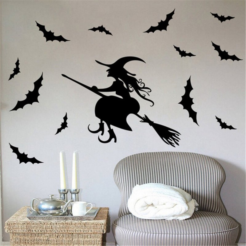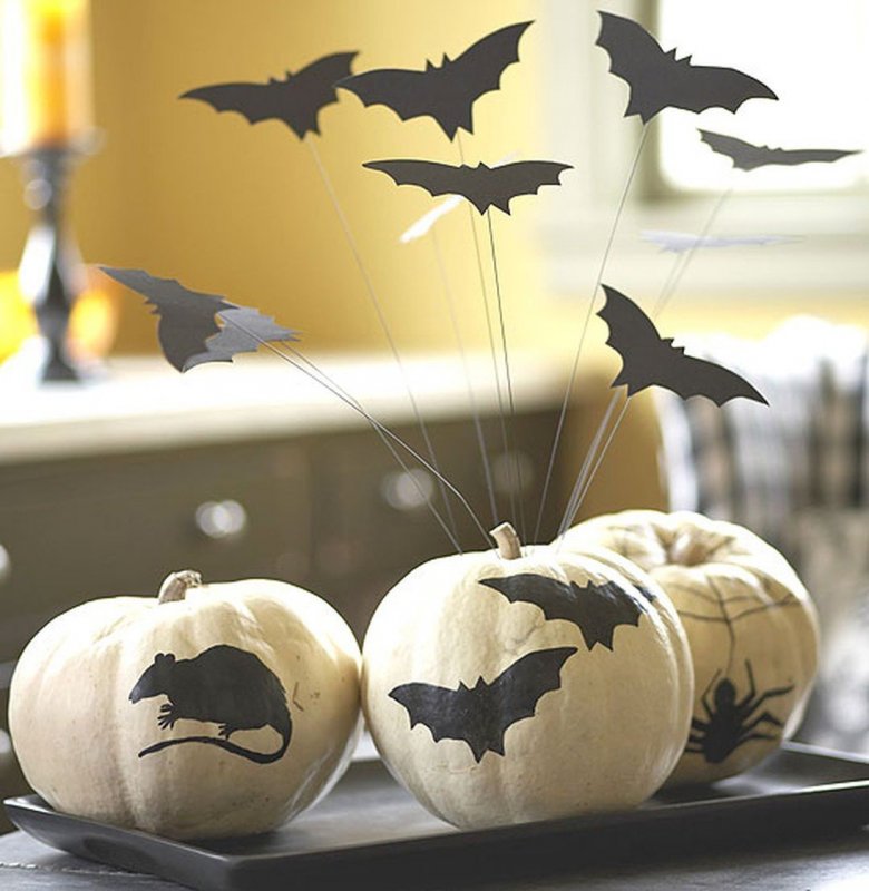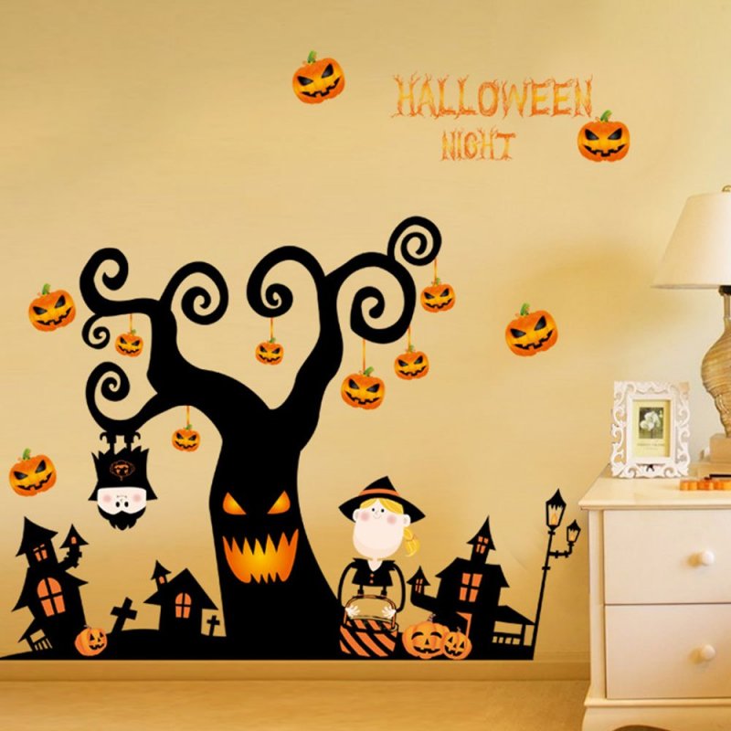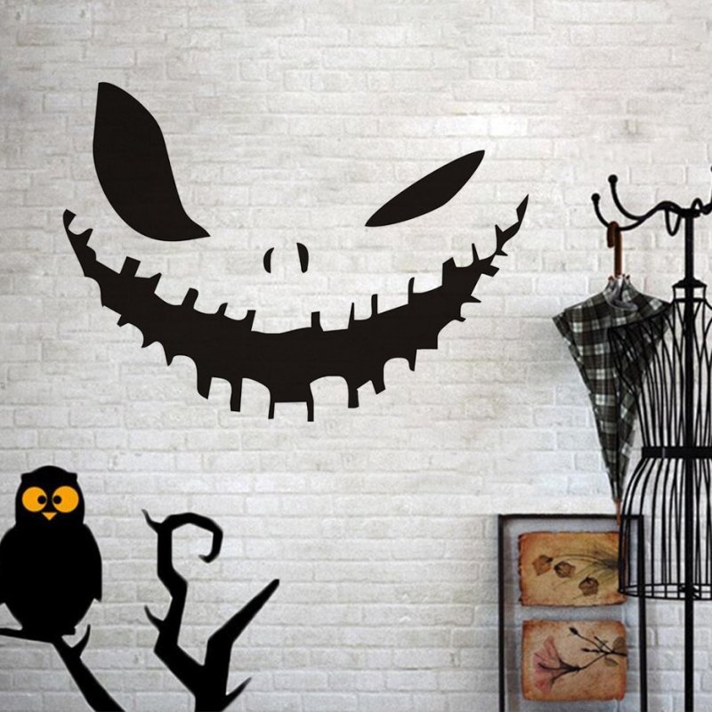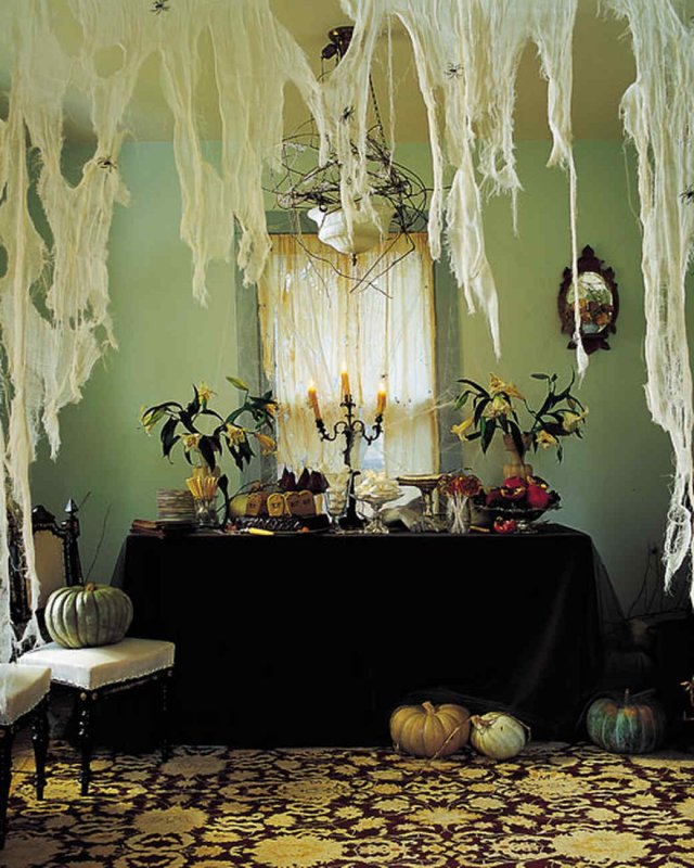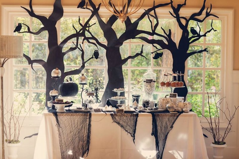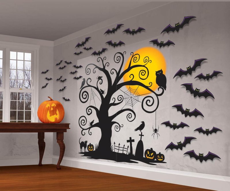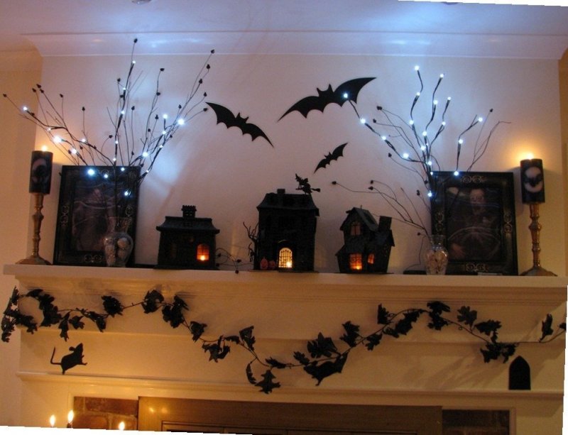 Стены декорируют различными хэллоуинскими украшениями. К искусственной живности относят летучих мышей, паучков и змей. Это тройка самых «мерзких гадов», поэтому и атмосфера их окружает соответствующая. Летучие мышки и паучки легко вырезаются из картона. Достаточно пары трафаретов с животными разных размеров, чтобы декор не выглядел, как штамповка. По шаблонам вырезают следы человеческих ног или лапок животных. Эти черные отпечатки цепочками наклеивают на стены, полы и потолок. На окнах закрепляют черные силуэты привидений, вырезанные из бумаги. Очень мрачно и необычно будут смотреться фигуры «висельников», подсвеченные из-за штор. Группу разных по размерам настенных зеркал обклеивают картинками с «жуткими» лицами, словно всматривающимися в гостей с другой стороны. Очень «злая» дверь будет встречать гостей, если ее украсить нахмуренной гримасой. Вверху закрепляют тканевые полоски, которые станут волосами. Под ними приклеивают глаза. Полоску рта заклеивают малярным скотчем. Из него же делают сурово сдвинутые брови. Великолепно будут смотреться настоящие деревья, украшенные стаей искусственных ворон, ветошью и свечами в стеклянных колбах. Из некоторых стен могут расти когтистые ведьминские руки. Можно обыграть сюжет Белоснежки и в одну из них положить бутафорское яблочко. Под потолком подвешивают плафоны из черного полиэтилена в форме остроконечных ведьминых шляп с фонариками внутри.