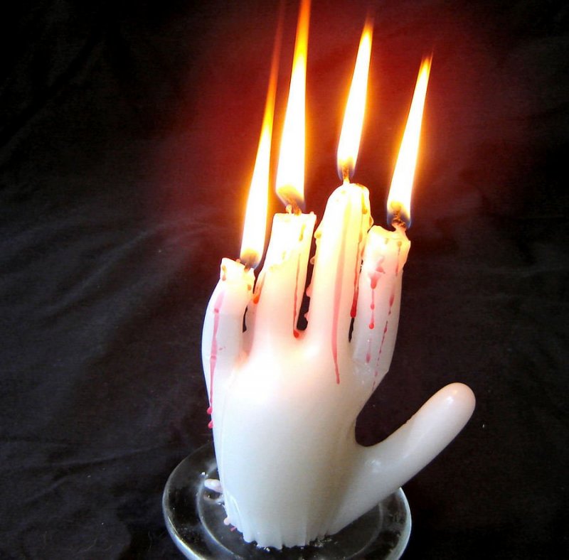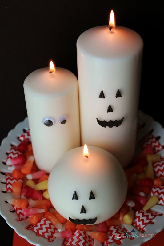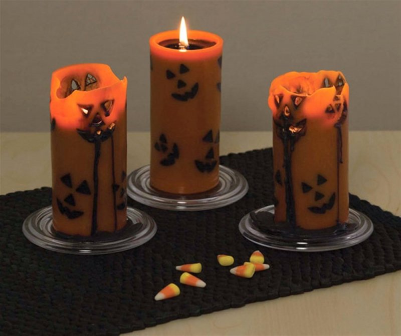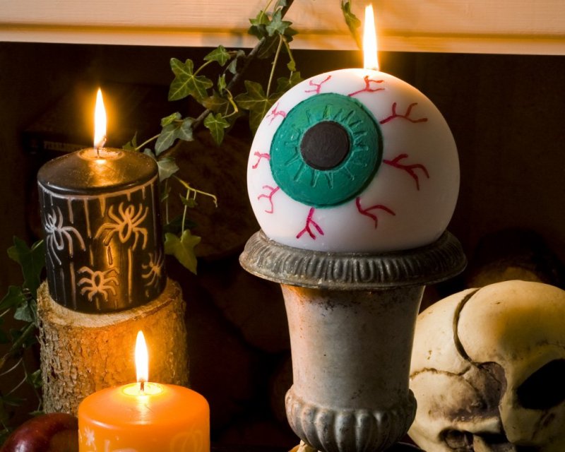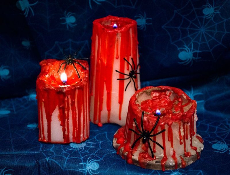 Белую свечку разрезают поперек на несколько кусочков разной длины. Используют канцелярский ножик. Резать нужно аккуратно, чтобы парафин не раскрошился. Затем на каждой миниатюрной свечке освобождают «хвостик» фитиля. Теперь их располагают на блюдце асимметричной группой. Красную свечу поджигают и щедро капают «кровавым» парафином на «тарелочную» композицию. С помощью состава проводят декорирование и закрепляют группу на блюдце. Композицию водружают в центре праздничного стола. Дополнительно можно проткнуть свечи в нескольких местах черными булавками или положить миниатюрных паучков возле блюдца.