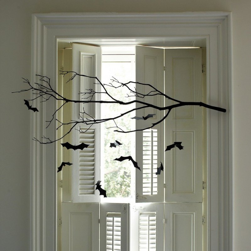 Ветки и коряги собирают прямо в парке или в лесу. Будущий декор заготавливают впрок, отряхивают от сора и тщательно просушивают. Затем поверхность веточек и коряг щедро покрывают черной краской. Именно этот цвет смотрится наиболее мрачно и эффектно. После того как декор высохнет, из него составляют композиции. Веточки собирают в «букеты». Их дополняют паутиной из ниток или марли и искусственными паучками. Коряги просто кладут на пол или на полки. Реалистично и зловеще будут смотреться чучела ворон, «сидящие» на ветках. Из ветвистой коряги можно сделать роскошный светильник. Ее украшают на манер новогодней елки крошечными тыковками-шариками. Опавшие листья тоже собирают в парках. Их достаточно только слегка подсушить и можно художественно разбрасывать по полу, подоконнику и полкам. Креативно будут смотреться широкие вазы и банки, заполненные листьями. Если же их нанизать на нитку, то получится осенняя гирлянда.