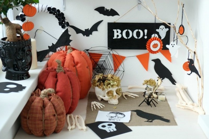 Декор на Хеллоуин должен быть страшным. «Кровь в жилах» от него вряд ли застынет, но легкий испуг и трепет оформление все же вызвать должно. Главный символ Хэллоуина — полая тыква. В штатах ее называют Jack-o-lanterns (Светильник Джека). На ней вырезают различные рожицы, которые подсвечивают изнутри фонариками. Также дома декорируют паутиной, летучими мышами, скелетами, светящимися костями, силуэтами привидений, сундучками со зловещими предсказаниями, мумиями, ведьмами, пауками и венками из змей. Украшения могут быть самыми разнообразными. Их заимствуют из родных культур и красиво адаптируют к классическим атрибутам Хэллоуина. Главное, чтобы декор был страшным.