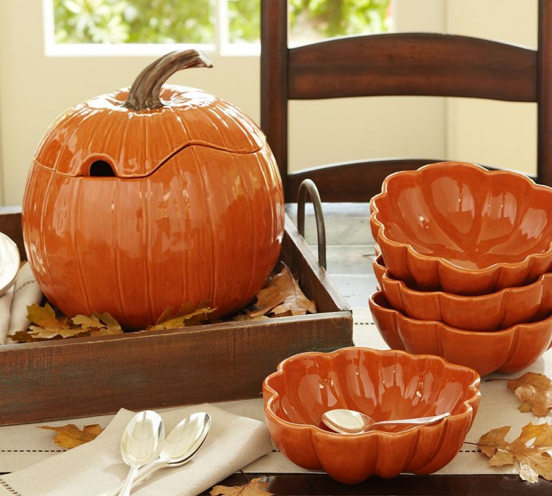 Тему Jack-o-lanterns можно обыграть иначе и подавать блюда в горшочках в форме овоща. Для первого подойдут и настоящие тыквы. В некоторых ресторанах традиционно именно так блюда и подают к столу. Графины, бокалы и бутылки можно покрасить в черный или оранжевый цвет. Достаточно вырезать шаблон и наклеить его на то место, которое не должно быть окрашено. Всю тару окунают в краску. После высыхания состава наклейку снимают. Чаще всего таким способом на бутылки и бокалы наносят «рожицы», выражающие различные эмоции. Сложные формы (черепа, например) воссоздать самостоятельно не всегда представляется возможным. Такую посуду лучше заблаговременно приобрести в специализированном магазине. Стаканы и чашки можно декорировать «кровоподтеками» из краски (нетоксичной). Лаконично, но устрашающе будут смотреться алые салфетки, свернутые трубочкой, и зафиксированные специальными клыкастыми челюстями-зажимами. Такой декор кладут на каждую тарелку. Лучше всего контрастирует кровавый материал с черной посудой, которая к тому же подчеркнет белизну «зубов».