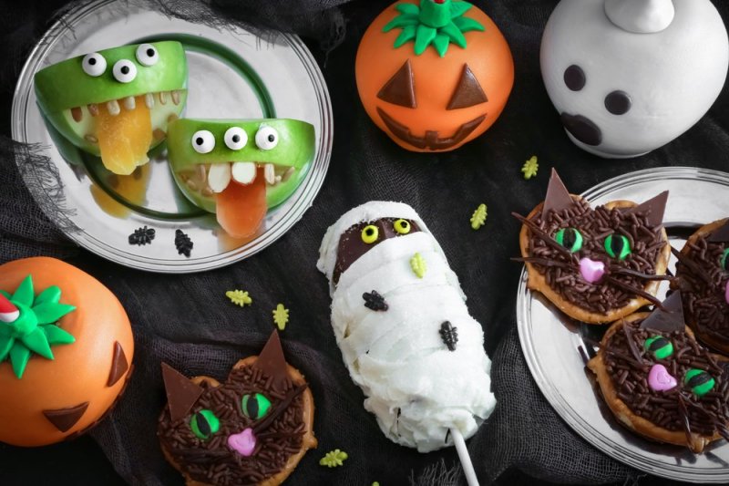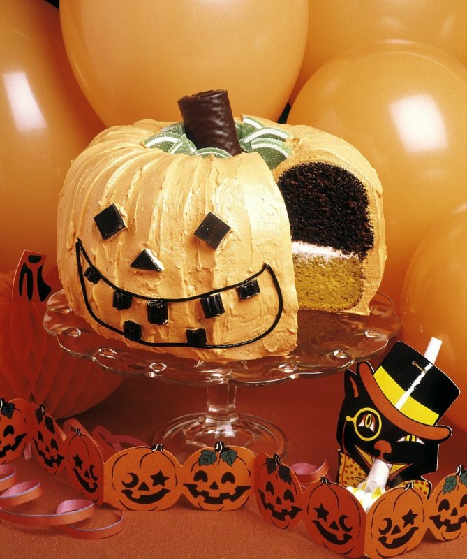 Меню должно удивлять не столько вкусом, сколько внешним видом. Ни один хэллоуинский стол не обходится без печенья. Им нужно запастись и для детей, которые в ультимативной форме будут требовать сладости. Для печенья заранее следует купить специальные формочки (в виде черепов, мозга, зубов и скелетов). Готовят выпечку по любимому рецепту. К печенью следует добавлять еще и конфеты. Лакомство заворачивают в оранжевую бумагу-креп или кусочки сетки и подвязывают либо зелеными ленточками (хвостики тыковок), либо атласными полосками. Из холодных напитков предпочтение отдают томатному соку для детей или «Поцелую вампира», «Кровавой Мэри» для взрослых. В любимый коктейль «кровососов» добавляют скользкие ягодки личи, которые напоминают глаза. Чтобы поразить гостей необычной подачей напитков, их разливают не в бокалы, а в шприцы. Инструменты наполняют гранатовым соком и кладут, как ложечки в бокалы. «Кровавый» соус из клюквы великолепно подойдет к закускам (курице или к мексиканским начос). Из зефира делают привидения, подрисовывая им глазки и ухмылки шоколадом. Такими малышами украшают тыквенный пирог. Дополнительно его можно декорировать «ведьмиными пальчиками» с крошечными коготками. Фаршированные яйца украшают пауками из оливок: одна половинка на тельце, а другую режут на полоски для лапок. Пенка шоколадного коктейля с россыпью молотого какао идеально имитирует «рыхлую землю». В нее помещают пару червячков из желе: отвратительное питье готово. На шпажки для канапе или зубочистки нанизывают виноградины. «Мордочку» мерзкой гусеницы украшают глазками из гвоздики. Миниатюрные метлы получаются из соломки и кусочков сыра с бахромой полосок. Подавать салаты можно в чашечках из апельсинов, которые готовят, как и тыквы. Вычищают мякоть (пойдет на сок), вырезают рожицу на боку и заполняют снедью.