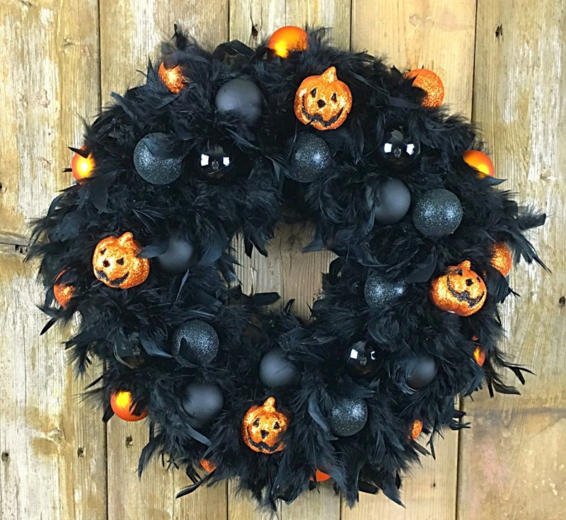 Делать венок не так сложно, так может показаться на первый взгляд. Начинают с проволочного каркаса, которому нужно придать правильную круглую форму. Затем его хорошенько обматывают ватой для придания объема и закрепляют ее ниткой. Далее к леске подвязывают новогодние шарики. Ее тоже наматывают на венок по кругу таким образом, чтобы декор распределился равномерно. Шарики окрашивают в черный, серый, оранжевый и покрывают блестками. Теперь черные перья собирают в пучки. Каждый букетик подвязывают к нитке, которую обматывают вокруг каркаса. Перьев используют много, чтобы в венке не образовывались пустоты. Их с легкостью можно заменить осенними листьями.