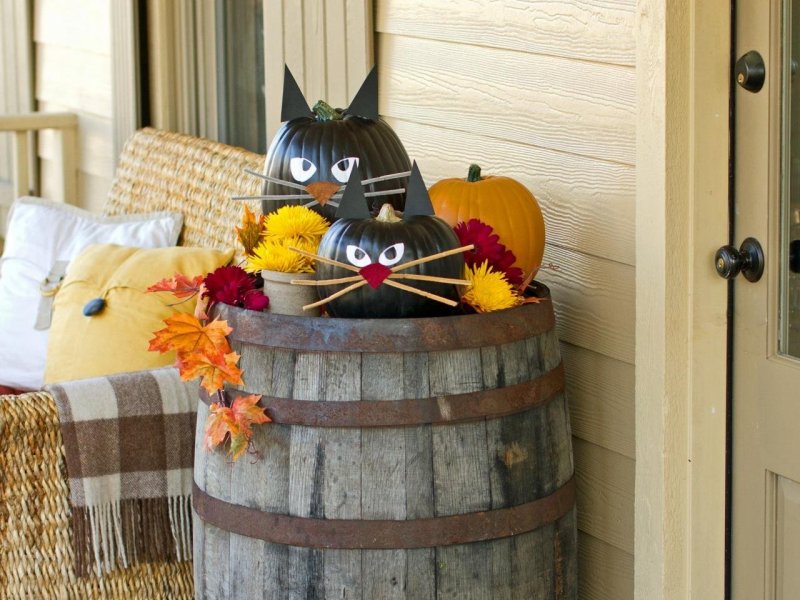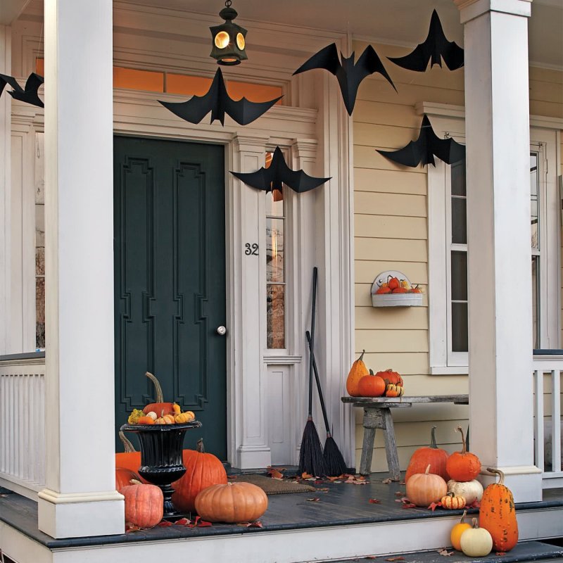 Главным украшением крыльца частного дома станет композиция из традиционных тыкв. Часто дворики декорируют группами симпатичных привидений, которые встречают гостей. Добавить хэллоуинский антураж участку помогут кривые коряги, композиции из голых веток, кучки осенних листьев и даже позабытые какой-то незадачливой ведьмой башмачки с «припаркованной» метлой. На ступеньки наклеивают картонные силуэты мышек или пауков. Гирлянды из черных и оранжевых воздушных шариков располагают над входом. Веранду или террасу покрывают слоем марлевой паутины и жуткими мохнатыми пауками. Венок из сухих веток на входной двери сразу покажет гостям, что их здесь ждут «большие хэллоуинские неприятности». Подчеркнуть декор можно с помощью подсветки.
