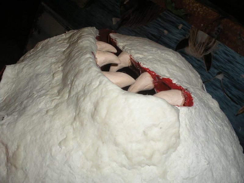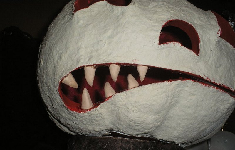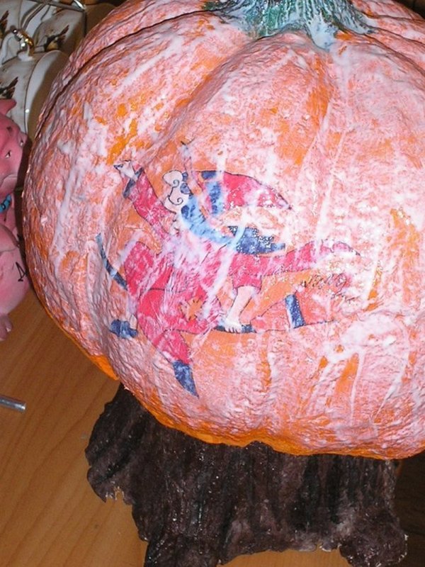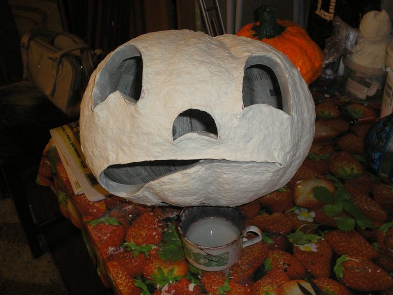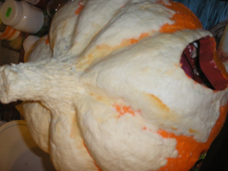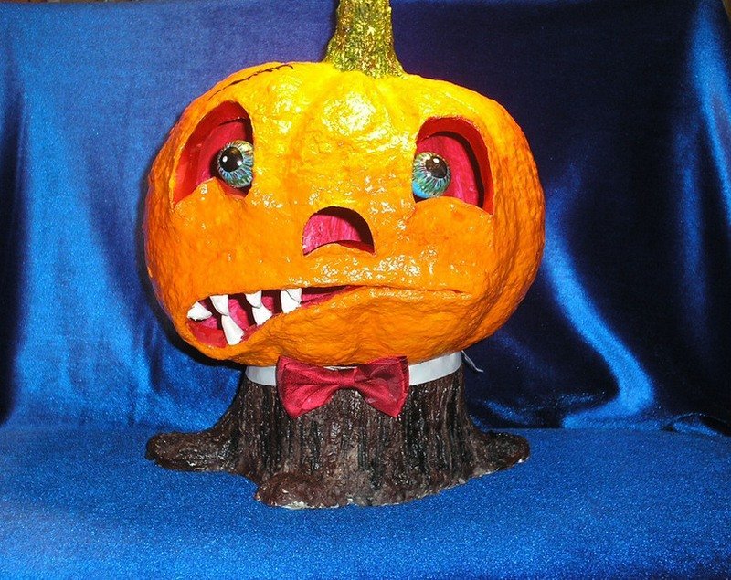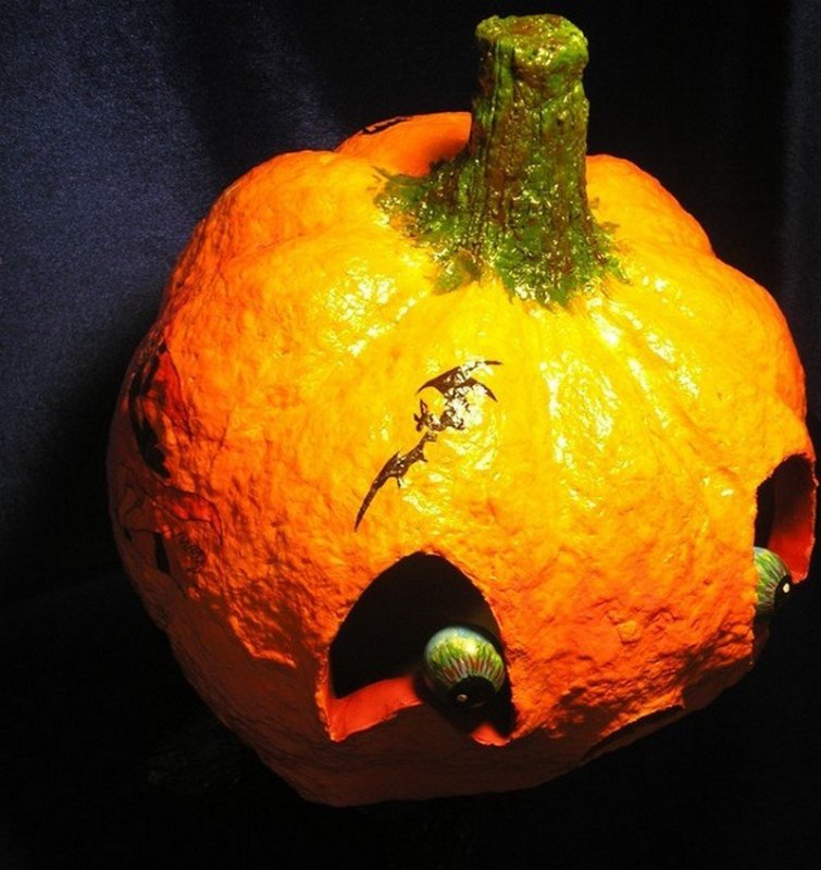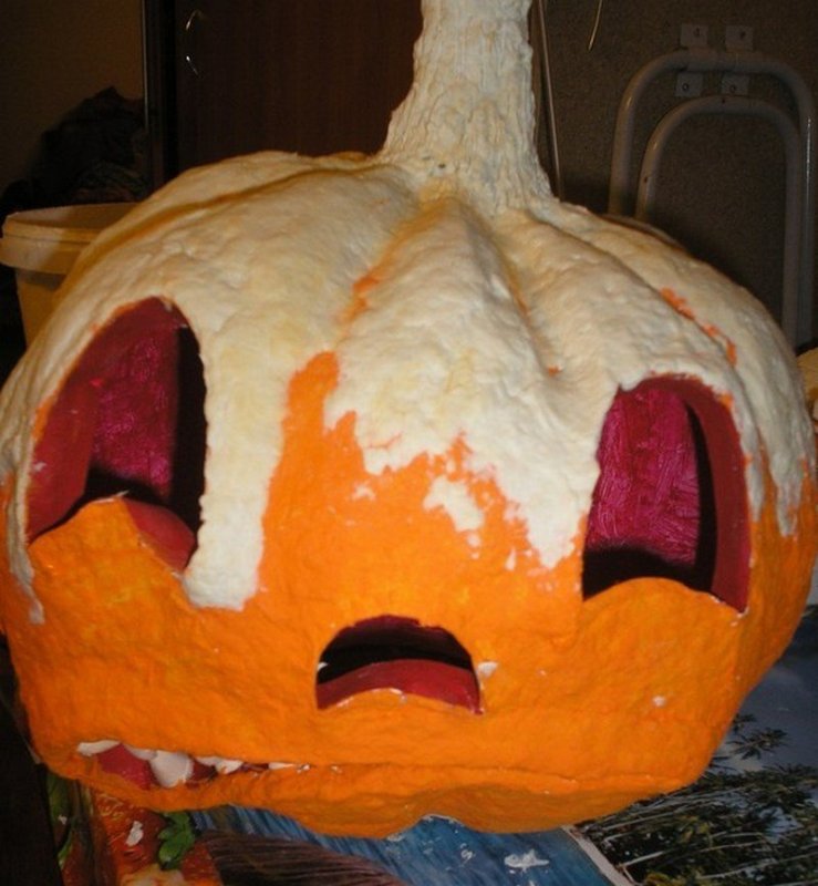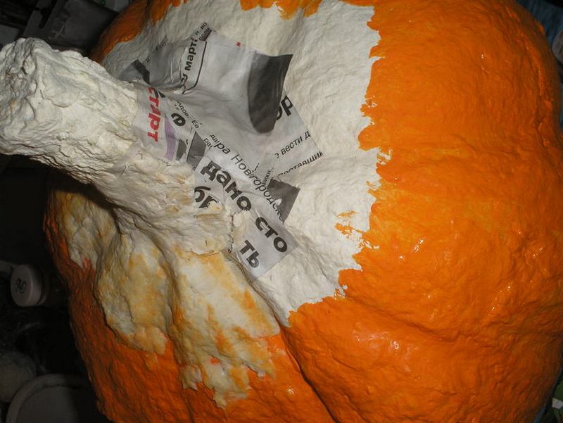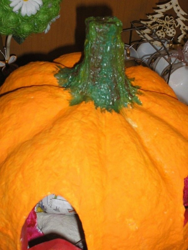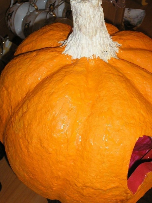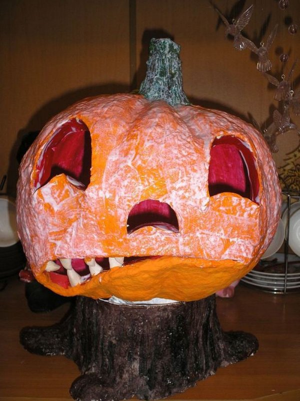 после верхушку тыквы срезают ножом или лобзиком, внутреннюю часть оформляют массой из папье-маше;