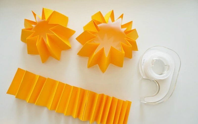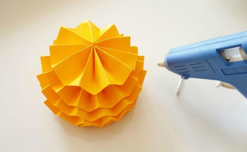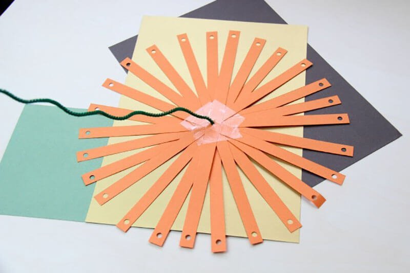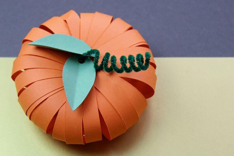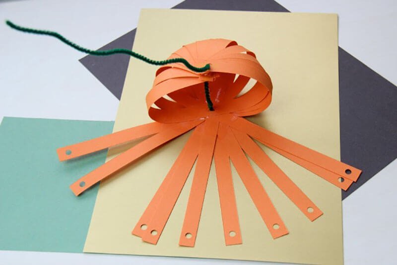 Самодельную бумажную тыковку изготавливают из узких полосок оранжевого цвета. Для работы понадобится: