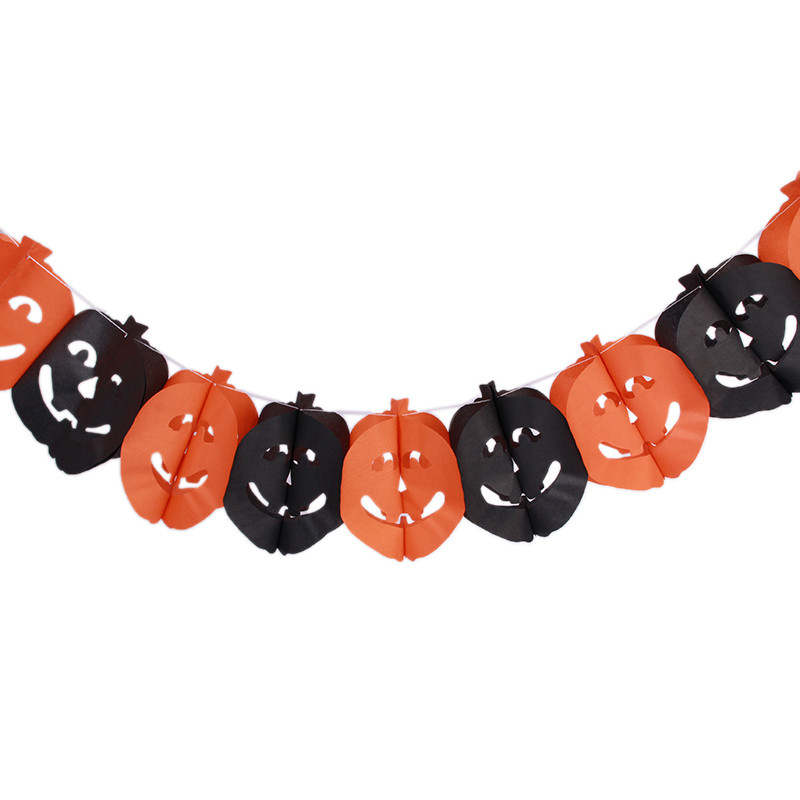 Такие фонарики будут похожи на новогодние, которые вешают на елку. Их вырезают из оранжевой бумаги, сгибают пополам вдоль, делая надрезы от середины, но не доходя до края два-три сантиметра. Листок разгибают, соединяют клеем короткие стороны. Черным маркером на каждом фонарике-тыкве прорисовываются улыбающиеся зубастые рожицы. В верхней части проделывается по два отверстия, через которые пропускают толстую нитку.