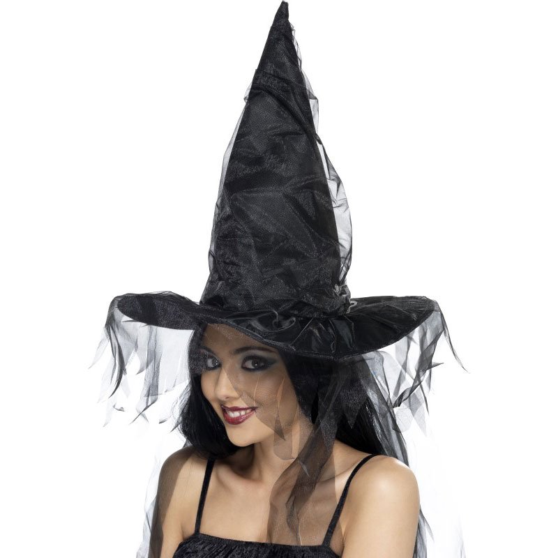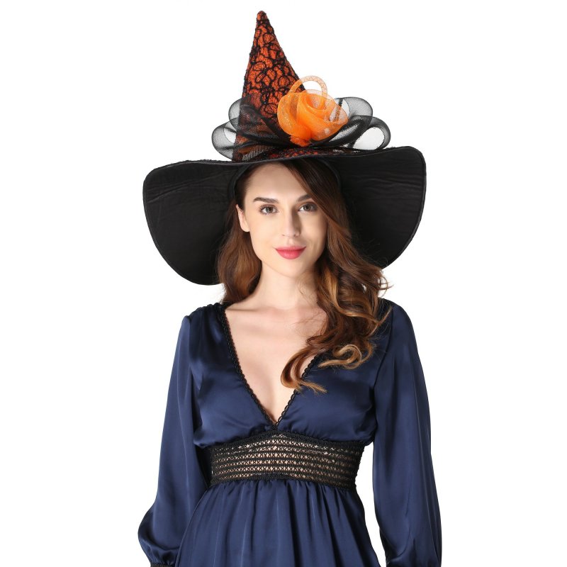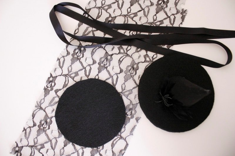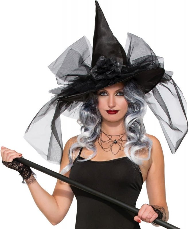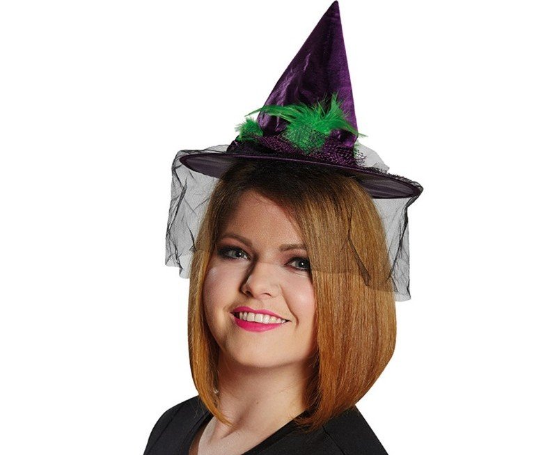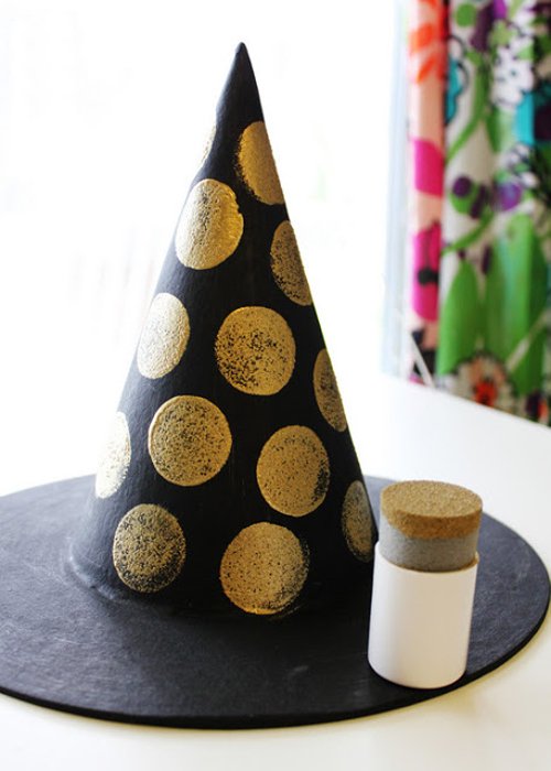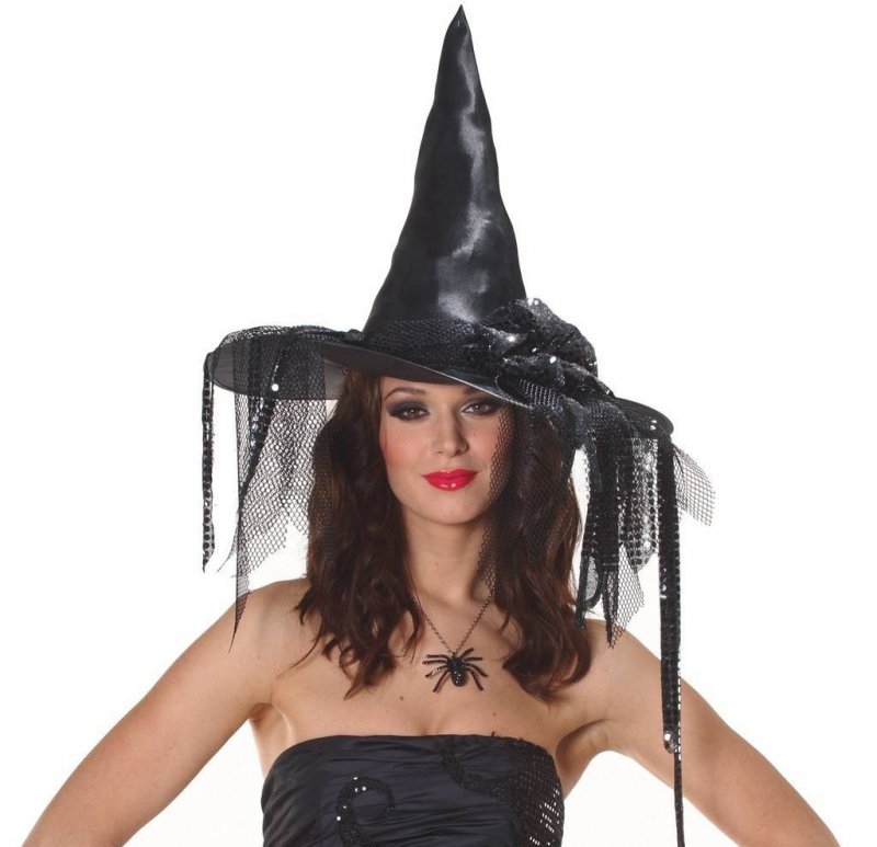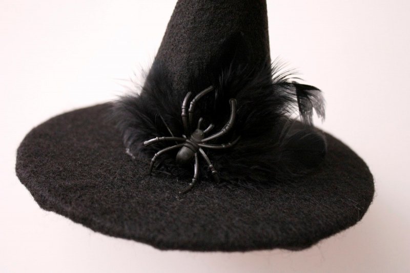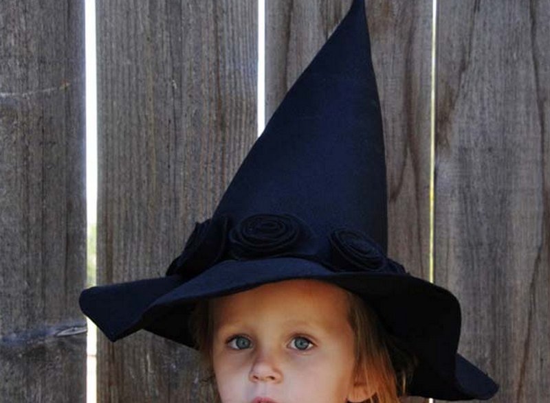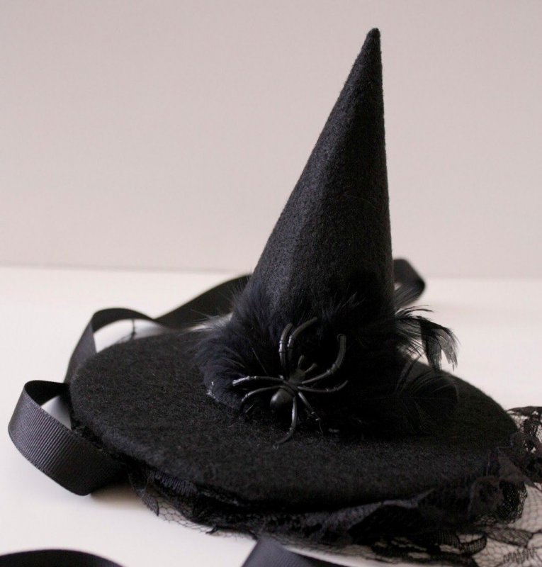 Остроконечную ведьмину шляпу из ткани украшают полупрозрачной сеткой. Вуаль пришивают к полям «изнутри». Большой «купол», который будет свисать со всех сторон головного убора, собирают под черную неприметную резинку и надевают сверху. Шляпы декорируют яркой шнуровкой, летучими мышами, змеями, пряжками, пучками перьев, паучками, картинно сползающими по ниточке с острого кончика. Великолепно смотрятся модели, изготовленные из черного шелка и декорированные ярко-оранжевыми «букетами» кленовых листьев. Скромные, но загадочные шляпки украшают серебряными нитями, опутывающими колпак. Дополняют декор крошечными стразами или звездочками. Чтобы подчеркнуть мрачный стиль, используют черепа, «коготки» мелких животных, миниатюрных воронов, которые водружают на поля головного убора. Оригинальный декор можно связать крючком. К примеру, легкий колпак из серой пряжи (ажурная вязка), будет имитировать паутину на черной шляпе.