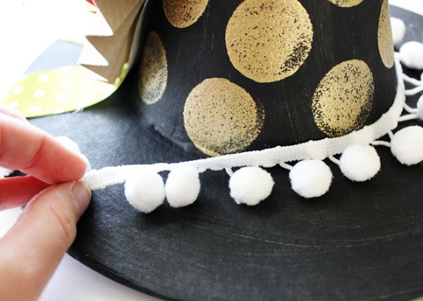 Чтобы избежать последующего окрашивания, шляпку изготавливают из «нарядного» картона, украшенного рисунком. Красиво будут смотреться модели с черными полями и узорчатой тульей. Если использовалась обычная бумага, то ее красят гуашью с помощью кисточки. Не рекомендуют применять акварельные краски. Из-за жидкой консистенции при высыхании состав вызовет деформацию бумаги и шапка «покорежится». Сверху еще влажную краску покрывают глиттером.