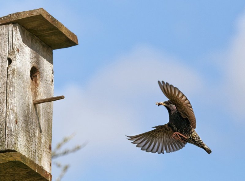 Скворцы предпочитают искать пищу в округе неподалеку от дома. Собственный сад они игнорируют. Эти пернатые станут полезными, если рядом имеется хозяйское поле или выгон для скота. Скворцы охотно уничтожают оводов и клещей у домашних животных. Маленькие птички не улетают далеко от дома и ведут деятельность по истреблению насекомых прямо на участке. Жердочка должна быть прочной (диаметр не менее 1 см). Ее длина не превышает 5 см. Козырек — обязательная деталь домика для птиц. Он защитит леток от попадания осадков и станет препятствием на пути любопытных кошек, желающих полакомиться обитателями квартиры на дереве. Козырек должен выступать на 5 см. Чтобы скворечник хорошо вентилировался, свободную циркуляцию воздуха обеспечивают с помощью отверстий. Четыре просверливают на основании домика и еще по два на каждой стенке. Диаметр отверстий составляет 0,5 — 0,6 см. Для свободного доступа человека к птичьему жилью с целью ежегодной уборки верхнюю крышку делают откидной. Не стоит наведываться в домик часто. Это может спугнуть птиц, что вынудит их отправиться на поиски другого пристанища. Достаточно убирать скворечник раз в год.