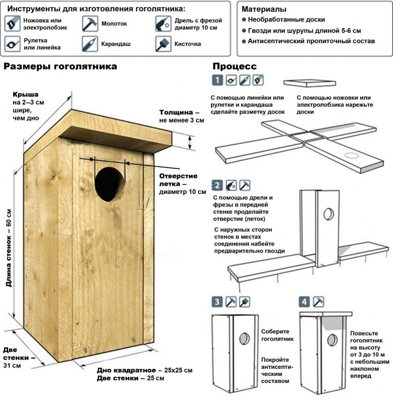Лучший материал для изготовления скворечника — дерево. Специалисты не рекомендуют использовать хвойные породы. Со временем древесина начнет выделять смолу. Птичка измажется в ней, а перья склеятся. Это негативно скажется на способности летать и приведет к гибели. Оптимальным материалом по мнению орнитологов, станут дуб, береза, ольха, клен или осина. Толщина досок должна составлять не менее 2 см. Иначе материал не обеспечит температуру, необходимую для выведения птенцов. Лицевые стороны досок шлифуют. Изнутри стенки оставляют без обработки. По шероховатой поверхности птицам удобнее перемещаться. Подходит для изготовления скворечника горбыль. Крайние доски — отходы, обработанные только с одной стороны. На другой остается кора. Горбыль используют для возведения временных заборов. Также скворечники изготавливают из полностью необструганных досок или бревен.