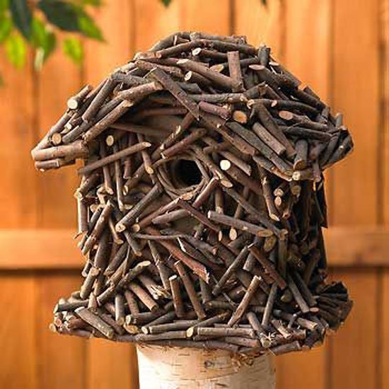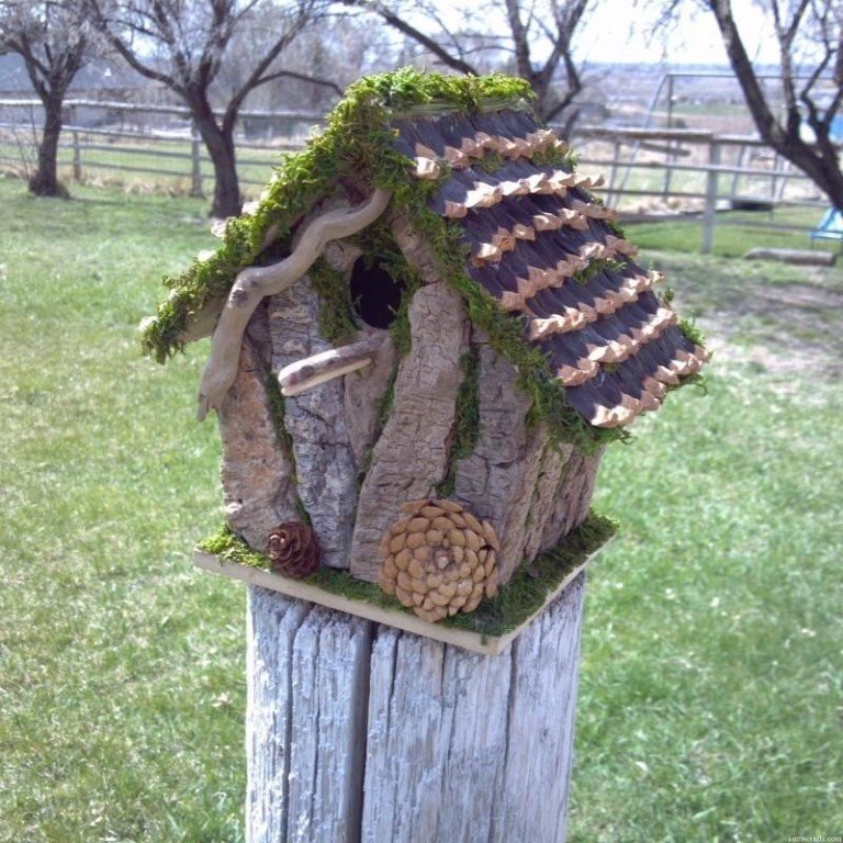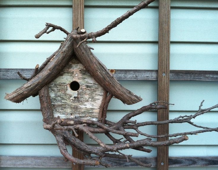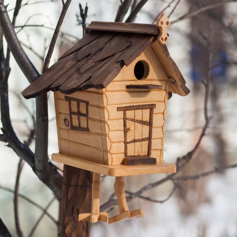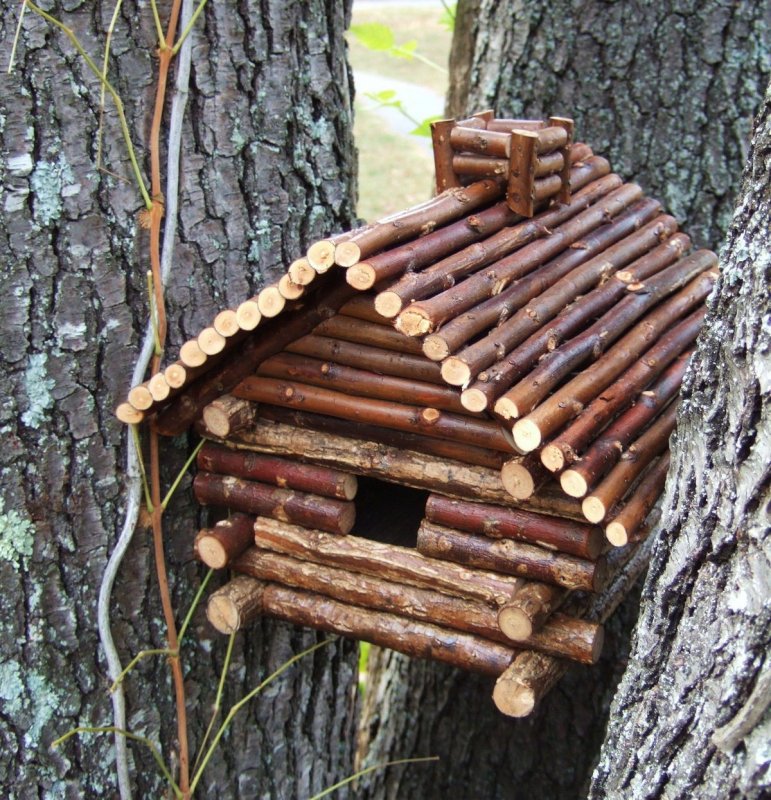 Из толстых веток изготавливают скворечники-срубы. Избушки сколачивают по тем же принципам, что и дома для людей, только по упрощенной схеме. Ветки в них заменяют бревна: