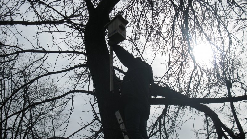 Для скворечника нужно правильно выбрать место. Размещают птичий домик в глубине сада. Его жильцы ценят удобство и безопасность. Оптимальное расстояние от земли — 3-5 м. Хищнику добраться сложно. Человек с помощью лестницы достанет домик для уборки. Для защиты птиц от нападок кошек, выбирают место на «голом» стволе. Вокруг расчищают ветки. По ним домашние любимцы смогут подобраться к летку близко. Скворечники вешают вертикально или с наклоном вперед. Птицам будет удобно взбираться по стенке к летку. Наклонять скворечник назад нежелательно. В домик будут попадать осадки. Не рекомендуют вешать скворечники в местах, где гуляют сквозняки или нет защиты от солнечных лучей. Птицам нужен покой. Если в саду устанавливают несколько скворечников, то расстояние между ними должно составлять не менее 50 см. Семьи пернатых не рады близкому соседству. Скворечник приколачивают к палке. Шест привязывают к стволу дерева веревкой или проволокой. Под нее подкладывают ткань или мешковину. Тогда веревка не врежется в кору и не навредит дереву. Шест закрепляют прочно, чтобы домик не раскачивался на ветру.