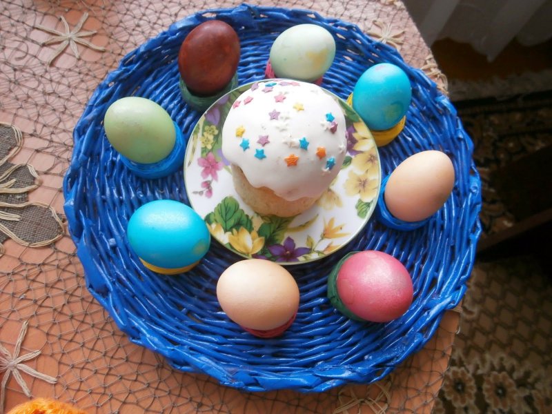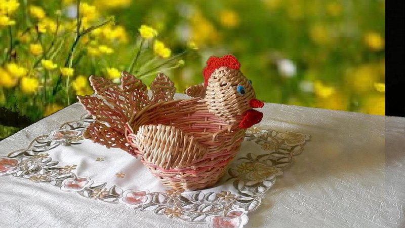 Основные пасхальные атрибуты – куличи, веночки, яйца в гнездышках. Интересная идея для оформления пасхального стола – курочка-корзинка. Основу плетут из 12-18 прутиков, любым удобным способом, но когда достигнута необходимая высота, несколько трубочек обрезаются и прячутся. Из остальных поочередно формируется голова и шея курочки, ее хвост, ручка корзины. При желании отдельно плетутся крылышки и лапки, которые приклеиваются в подходящих местах. К готовому изделию приделывают клюв, глазки, гребешок, а вдоль бортика корзинки – тонкое кружево.