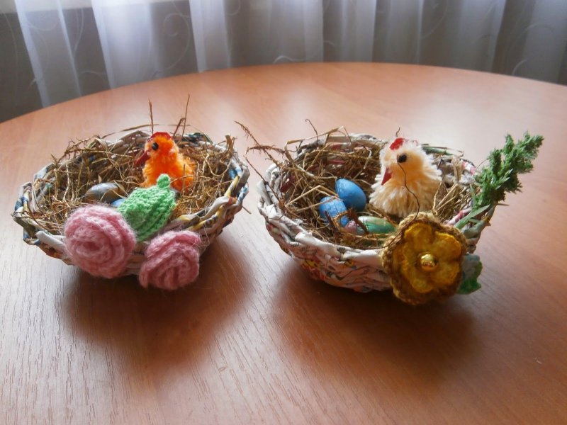Плетенные из газет яйца кладут в корзинку-курочку или используют в качестве самостоятельного декора. В качестве основы используются пустые, но целые скорлупки от куриных яиц. Плести начинают тремя-пятью прутиками, загибая их друг за друга. В конце прутики обрезают, а яйцо раскрашивают.