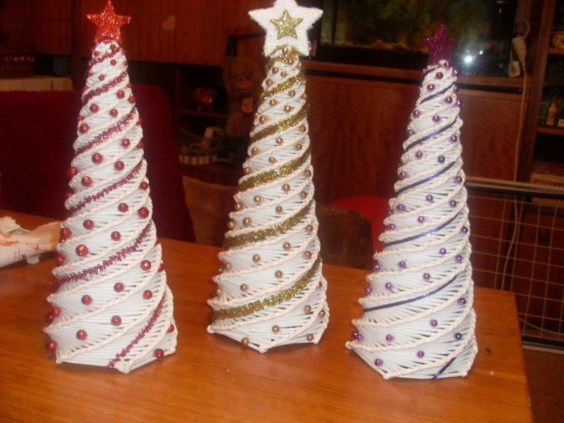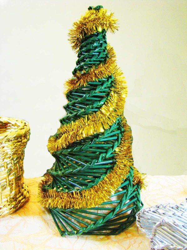 Новогодний праздник украшают плетеной елкой. Для нее понадобится основа – картонный конус подходящего размера, который оплетают по спирали или тканевым плетением. После изделие окрашивается в зеленый цвет, оклеивается белыми кружевами, бумажными снежинками, блестками, дождиком.