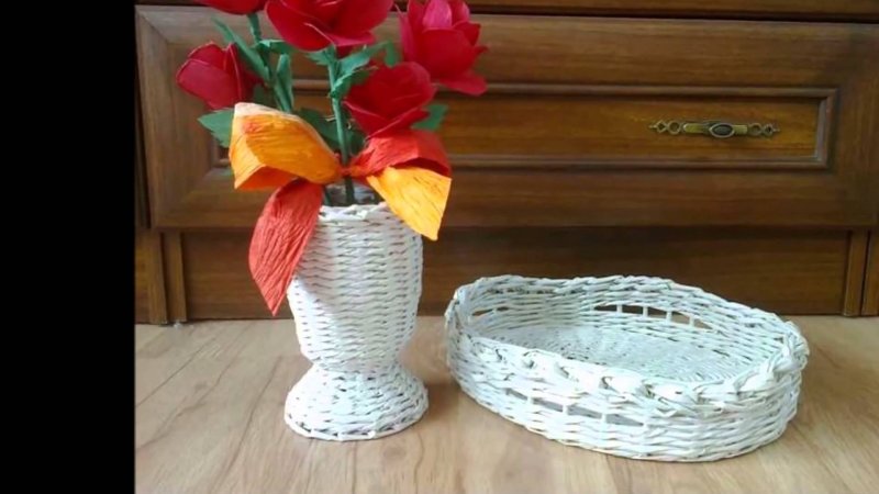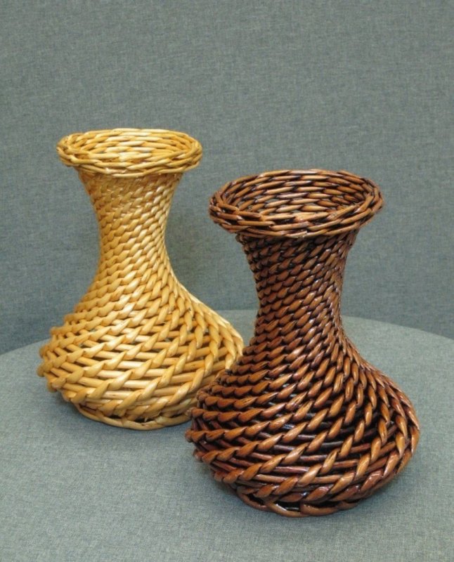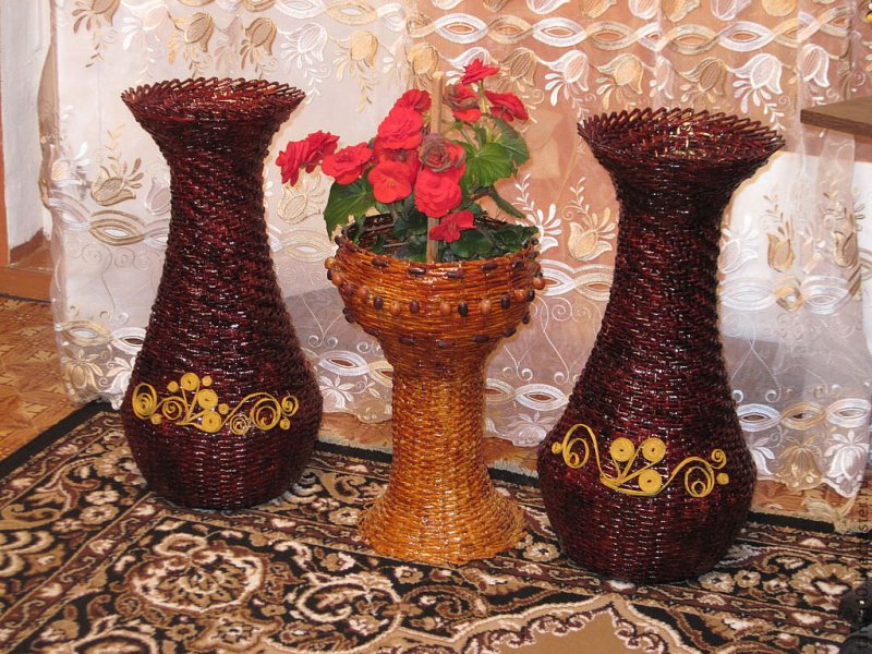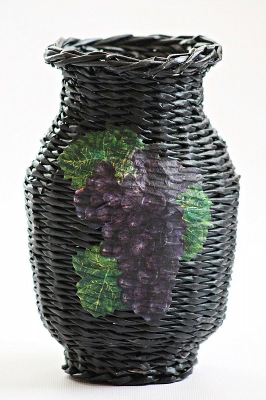 Чтобы создать настоящую вазу для цветов, газетными прутиками оплетают любую подходящую емкость – бутылку, банку, простую вазочку без декора. Ее плетут простым, спиральным или тканевым способом. В конце работы прутики обрезаются, закрепляются клеем на изнаночной стороне, вазочка покрывается красками или лаком. Если ваза достаточно крупная, например, напольная, а основу из нее планируется вынуть, то конструкция дополнительно пропитывается клеем ПВА. Готовое изделие декорируют осенними сухоцветами, живыми цветами, бабочками, другой отделкой из бумаги, цветных лент.
