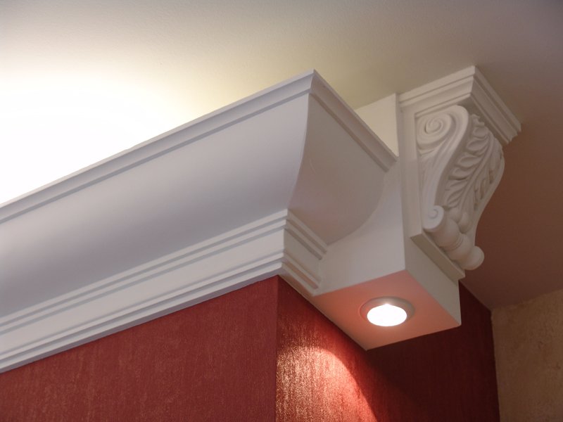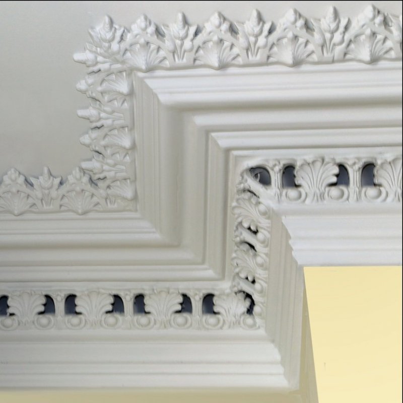Молдинг – объемная, рельефная деталь длиной до 2-2,5 метров. С помощью него маскируются стыки потолка со стеной, пола со стеной, а также оформления зеркал, картин, арок, дверных проемов, каминов, рам и др. Они выпускаются двух видов: гладкие тяги из гипса, имеющие гладкий профиль различного сечения и с рельефными узорами – растительными, геральдическими, фантазийными. Для светлых комнат предпочтительны молдинги темных цветов, в помещениях с низкими потолками недопустимы чрезмерно широкие.