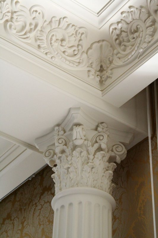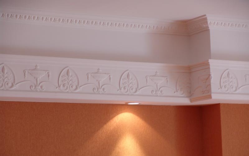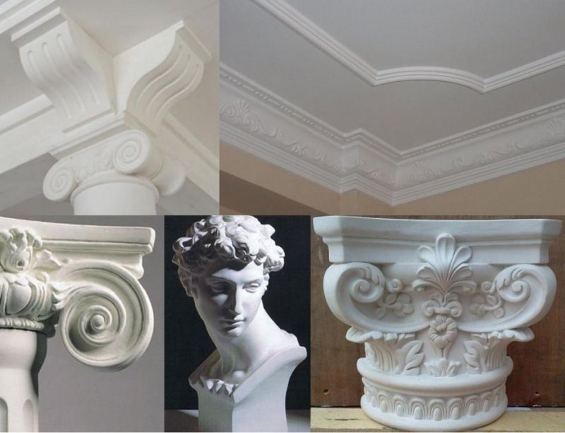 Потолочные, напольные плинтусы из гипса скрывают стыки между стенами и потолком, стеной и полом, зрительно выравнивая слегка кривые поверхности. Такая отделка часто используется в классическом стиле. Перепады влажности, температуры не приведут к разрушению конструкции, а при механических повреждениях посторонними предметами, плинтус легко отреставрировать. Данный предмет выпускается различной длины, ширины, стоит относительно недорого, клеить его можно на стены из кирпича, покрытые цементом и другие. В продаже имеются гладкие или лепные варианты.
