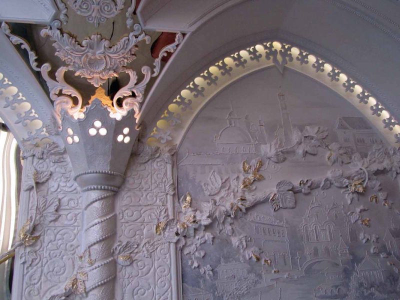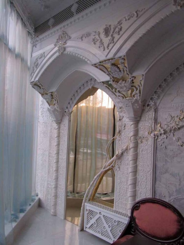 Гипсовая конструкция армируется металлом, декорируется объемными деталями, окрашивается в белый цвет, украшается позолотой, бронзированием.