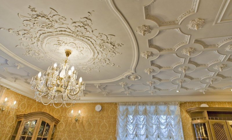 Декорирование потолка розетками обычно производится вокруг центральной люстры. Розетки скрывают место крепления люстры, они выполняются круглой, квадратной, асимметричной конфигурации, украшаются геометрическими, растительными, геральдическими узорами. С помощью правильно подобранного элемента, можно не только надежно спрятать все провода, но и придать помещению аристократический вид, создав интересный акцент. Закрепить конструкцию возможно на любых потолках, но для натяжных, подвесных, гипсокартонных сначала требуется монтаж закладных брусков.