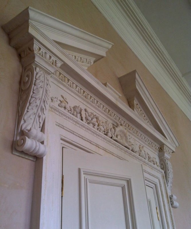 Фронтон – это передняя часть стенки, наиболее крупная из всех возможных гипсовых деталей. Данным элементом декорируют оконные, дверные проемы, настенные панно. По форме они выполняются прямоугольные, квадратные, трапециевидные, треугольные, полукруглые, ступенчатые, с боковыми карнизами. Фронтоны снаружи здания сверху ограничиваются крышей, играют не только декоративную роль, но и защищают помещение от холода, ветра, на них опираются стропила кровли. Лепные узоры данной конструкции представляют собой мифологические сюжеты, растительные орнаменты, геометрические или геральдические узоры. Изделие отлично сочетается с другими отделочными материалами.