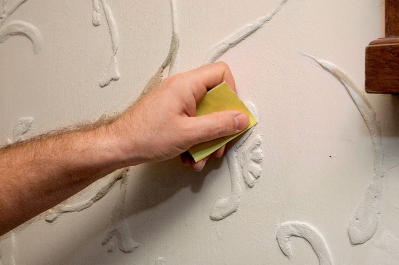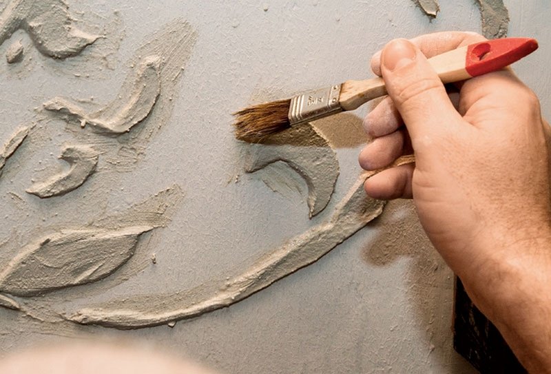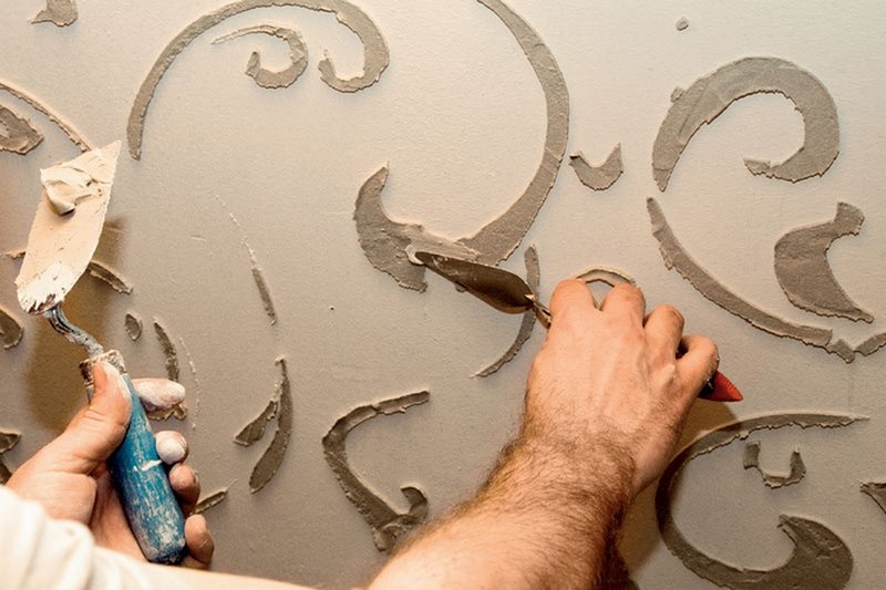 Для создания такого барельефа потребуется шаблон, толщиной один-три миллиметра, шпаклевка из специального акрила, которая наносится послойно шпателем. Трафарет убирают, когда состав только-только схватился, но еще не до конца застыл. Если имеются заметные неровности, их шлифуют наждачной бумагой, потом окрашивают, дожидаются полного высыхания.
