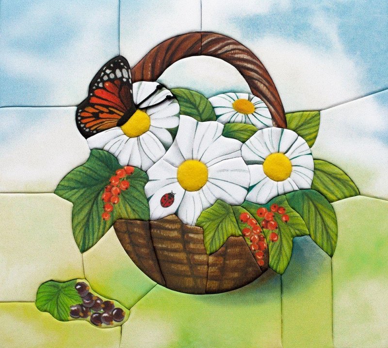 Создать аппликацию просто. Главное наличие идеи, схема которой воплотится на полотне. Основой изделия должны служить плотные ткани. В качестве материала для эскизов берут картон. На вырезы из картона накладывают ткани разной расцветки и крепят иглами, после чего делается выкройка. Полученные элементы можно пришивать или приклеить к основе. В заключение остается нанести декор в виде страз, пенопласта, бусин. Такое простое выполнение действий позволяет создать изящное изделие. В этом и заключается мастер-класс по изготовлению аппликаций из лоскутов.