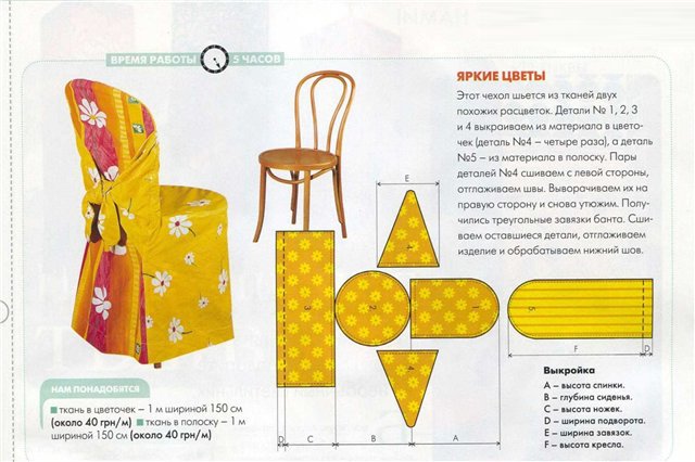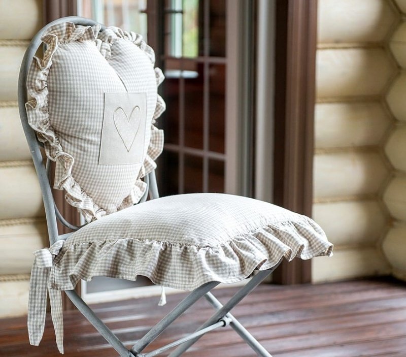 Все зависит от умения и фантазии. Рекомендуется освоить несколько мастер-классов. Цвет и стилистическое оформление могут не совпадать с дизайном помещения, это допустимо. Форма чехла для сиденья бывает в основном двух видов: круг и квадрат. Сидушка может быть тонкой, средней толщины или толстой. Верхнюю часть чехла можно делать похожей на толстую сидушку, но с лямками в качестве крепления. Если накидка выполняется в традиционной манере, т. е. облегает стул со всех сторон, то выполняться она может во многих вариантах. Цельный чехол покрывает все части мебели, за исключением низа — эту часть делают по-разному: или до самого пола, или слегка закрывают сиденье. Раздельный вариант дает возможность выбирать длину и для спинки. Верхняя накидка тоже будет крепиться завязками или креплениями-завязками (за бока спинки). Можно сшить нарядную «версию» с бантами, рюшами, расширенным низом.
