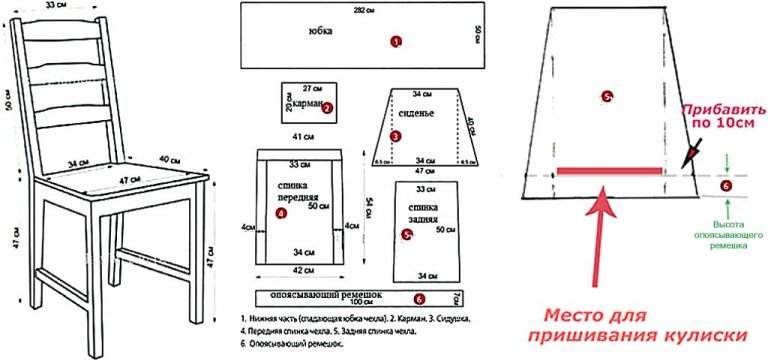 Бумагу прикладывают к сиденью стула, крепят портновскими иглами и обводят по краям. Делают запас около полутора сантиметров для припуска. Далее вырезается деталь. Выкройка из спинки делается таким же образом. Потом на листе рисуется прямоугольник, соответствующий длине ножек и ширине сиденья у переда «юбки», и к нему прибавляется 10 см выкройки сбоку, 5 см внизу и 1,5 см припуска на верхний шов. Подобным образом проводится черчение боков. К краю рядом с внешней частью спинки добавляется 15 см. К наружной части прикладывается длинный, широкий лист. В чертеже задних ножек стула прибавляется 5 см внизу и 1,5 см для припуска. Выкройки разглаживаются, потому что во время шитья помешают любые неровности. Далее чертеж переносится на материал с учетом положения долевой нитки. Рисовать на ткани можно карандашом, кусочком мыла или мелом. Выкройка производится в двух образцах.