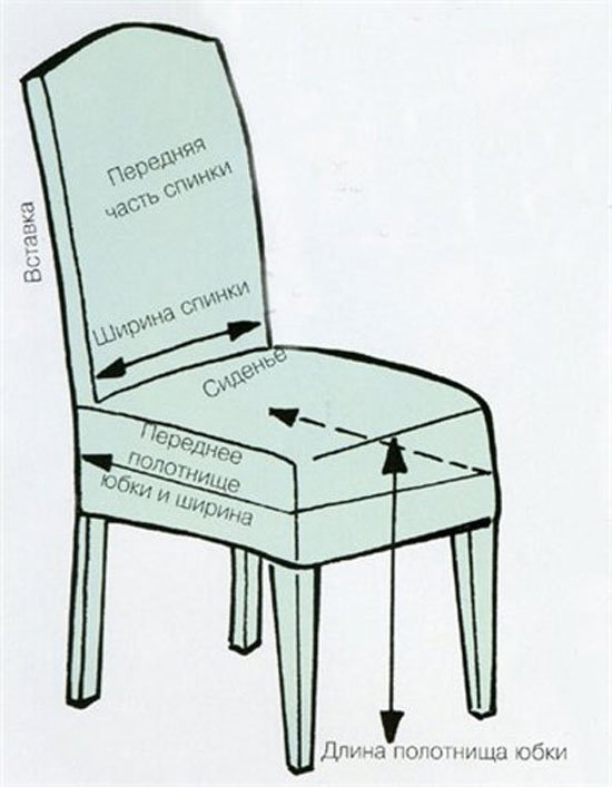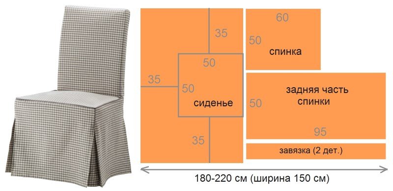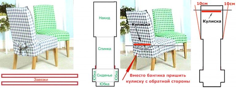 Вначале измеряется длина и ширина спинки, а также высота стула. Для кухни рекомендуется делать накидки не на всю длину, а с запасом до 30 см. Для зала подойдут чехлы до самого пола. При шитье нужно учитывать и толщину спинки, так как она может быть очень тонкой (меньше 1 см) или толстой (до 6 см). Ширина куска ткани должна быть на 2—5 см больше, чем стула. Длина фрагмента определяется суммой двух длин спинки, показателя длины сиденья и его высоты, умноженной на два. К этому числу потребуется прибавить запас для швов. Отрез накидывается на стульчик, регулируются длины, отмечаются места под крепления. В итоге накидка шьется так, чтобы привязываться к ножкам с помощью завязок или соединяться между полами креплениями-завязками. Во втором случае двух-трех таких элементов будет достаточно. Их лучше расположить сзади на спинке.