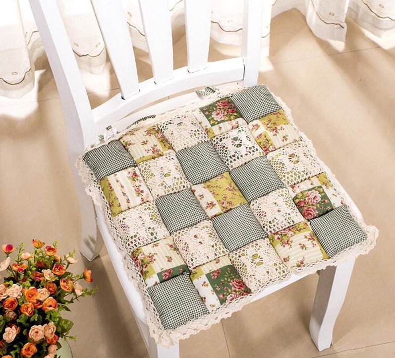 Сначала готовится выкройка. Понадобятся карандаш и газета. Потом эти замеры переносятся на сложенный вдвое материал. На каждую из ножек потребуются две завязки длиной около 10 см. По аналогичному чертежу вырезается синтепон. Параметры ширины и длины при этом уменьшаются на 1 см. Шнурки необходимо сложить вдвое по ширине, изнанкой наружу; после этого прострочить и вывернуть на лицевую сторону. Несколькими крупными стежками нужно прикрепить синтепон к изнанке и завязки к углам. Теперь строчится вся сидушка, кроме промежутка длиной 20 см. Через него чехол будет вывернут на лицевую сторону. Края деталей сшивают потайным швом. Дальше сиденье обрабатывается утюгом. Если есть желание, в самом конце нужно приступить к окончательному оформлению с помощью лент и различных декоративных элементов. На все это уйдет не больше нескольких часов, а если имеется опыт в шитье — полчаса-час.