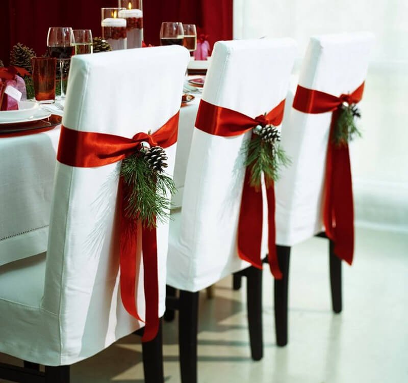 Процесс самостоятельного изготовления праздничного чехла ничем не отличается от создания накидки на стул со спинкой. Главное различие заключается в стоимости материалов. Стулья должны подчеркивать торжественную обстановку, поэтому украшаются разнообразными декоративными элементами: бантами, лентами, узорами. Такие накидки используются на банкетах и церемониях. Поводом для создания праздничной накидки могут быть такие события, как Рождество, Новый год, традиционные праздники, прием гостей, дни рождения, юбилеи. Новогодний чехол следует оформить елочками, «шапками Деда Мороза». Рекомендуется подбирать самый дорогой текстиль, в ярких тонах. Но подойдет любая более-менее нарядная ткань. Уместно использование штор и тюлей под материал для пошива. На чехле иногда создают липучки для размещения различных аппликаций.