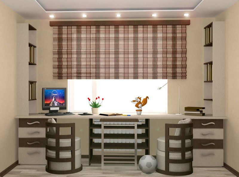 Письменный стол в детской комнате или спальне подростка — простой и оригинальный дизайнерский вариант. К сожалению, семьи обычно не могут выделить для своего чада помещение с большой площадью. Ребенку обычно приходится ютиться в небольшой комнатке, но при этом для него нужно обустроить сразу несколько функциональных зон. Для крохи достаточно игровой площадки, где он будет совмещать обучение и развлечения. Школьнику уже нужно полноценное место для учебы. Если объединить встроенную длинную столешницу у окна с небольшим шкафчиком-пеналом, то получится уютное рабочее место с хорошим естественным освещением. Еще один простой, но стильный вариант для школьника — угловой столик, который тянется от бывшего подоконника и «заходит» на ближайшую стену. На такой длинной столешнице можно разместить одновременно несколько зон: для творчества и игр, для письменной работы и чтения, для компьютера.