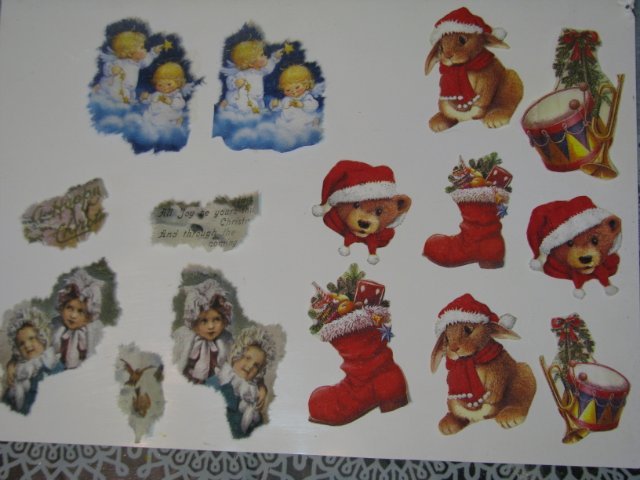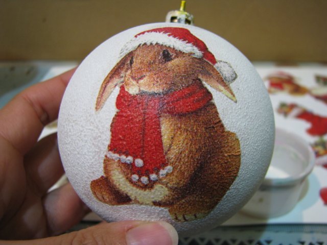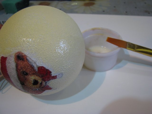 На подготовленную поверхность шара прикладываем картинки нужного размера и приклеиваем клеем ПВА. Все края надо хорошо расправить, чтобы не было морщин и накладок. На обратной стороне игрушки можно нарисовать краской снежинки, украсить блестками, лентами.