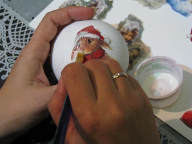 Для декора можно взять салфетки с любой тематикой. Главное, чтобы рисунки совпадали с размером шара. Вырезаем картинки, проглаживаем утюгом, отделяем тонкую бумагу от основы и прикладываем к изделию. Крепят салфетки к шару при помощи смеси клея с водой. Небольшой кисточкой надо промазать приложенную к шару бумагу и оставить высыхать. При помощи краски и блесток можно обвести контур, например, выбелить пламя свечи, бороду Деда Мороза, перья скворца. Завершающий шаг декупажа – покрытие акриловым лаком.