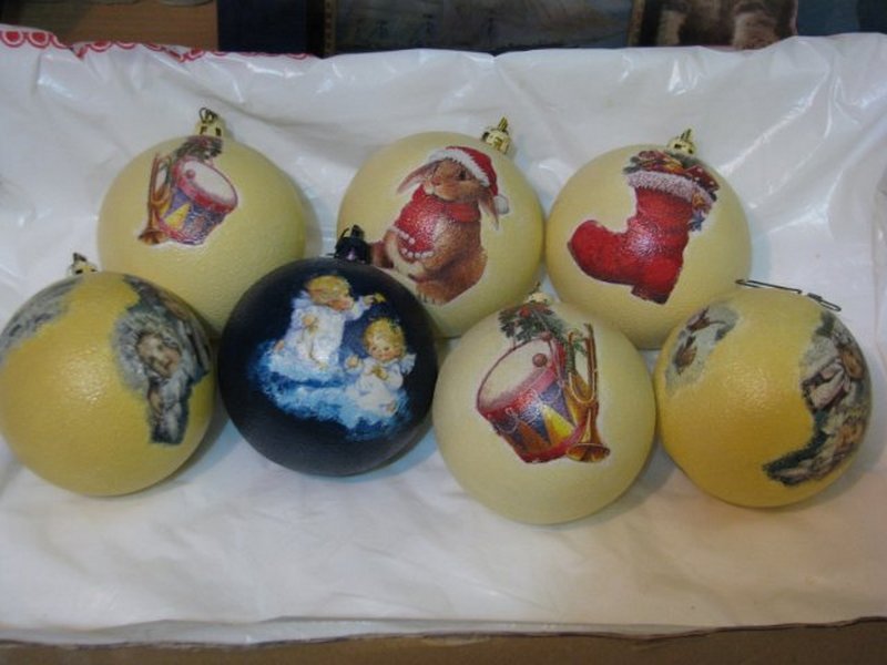 Для декупажной росписи лучше выбрать стеклянные матовые шары. С пластиковыми игрушками работать сложнее, поскольку у них видны стыки и слишком гладкая поверхность.